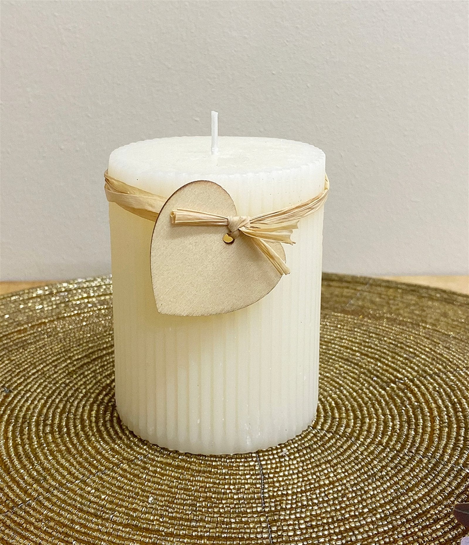Small Cream Ridged Pillar Candle with Heart Decoration
