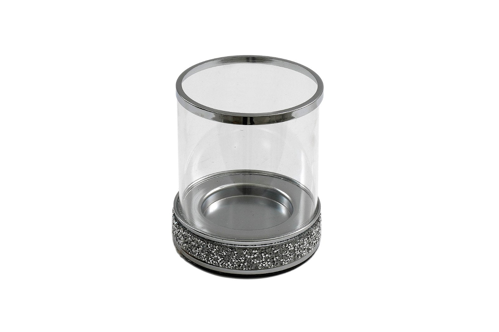 A beautiful pillar candle holder with scatter gem detail paired with polished chrome and glass. This statement piece will add a touch of glamour to any room. Measurements: D14 x H16.5 x W13.6cm