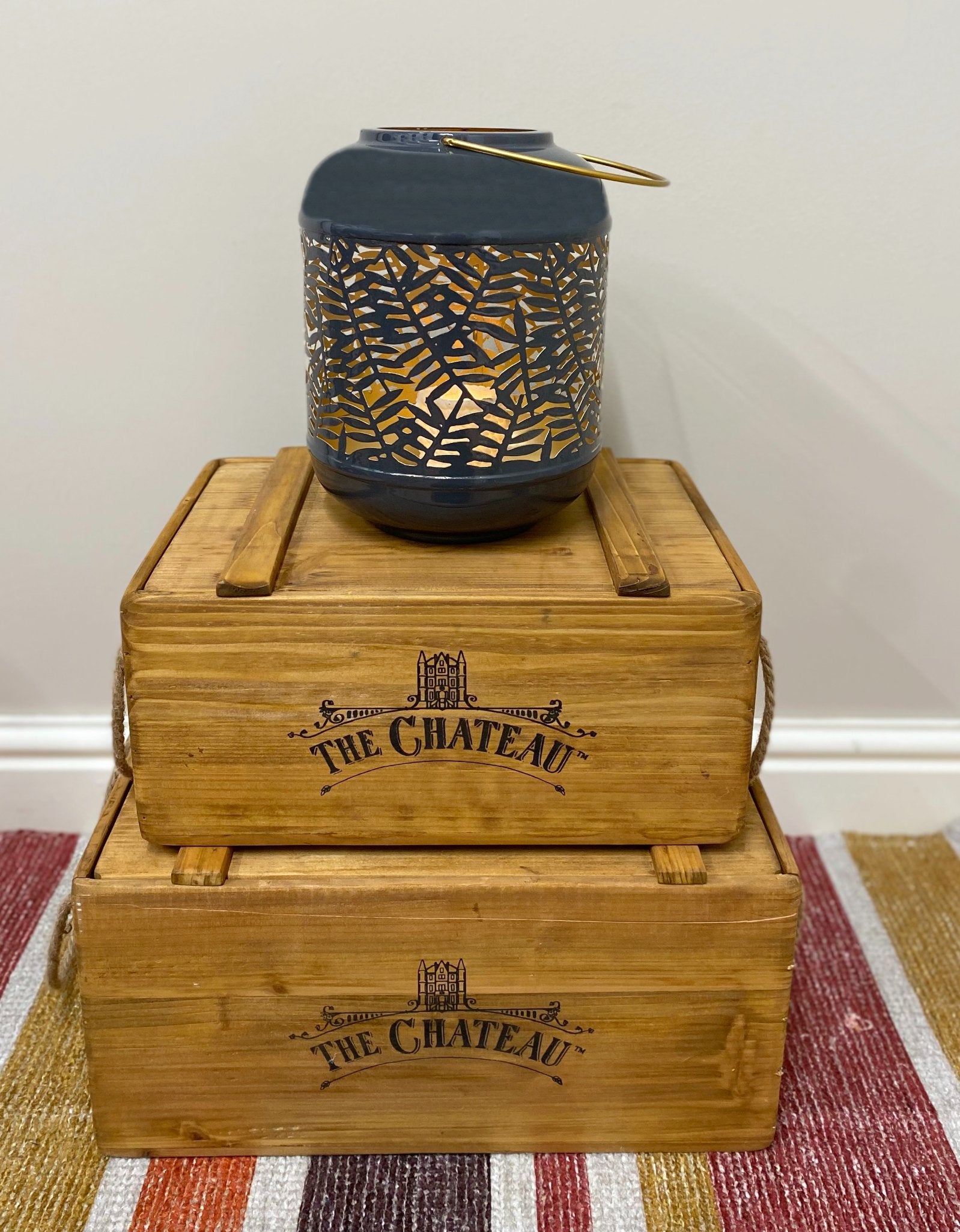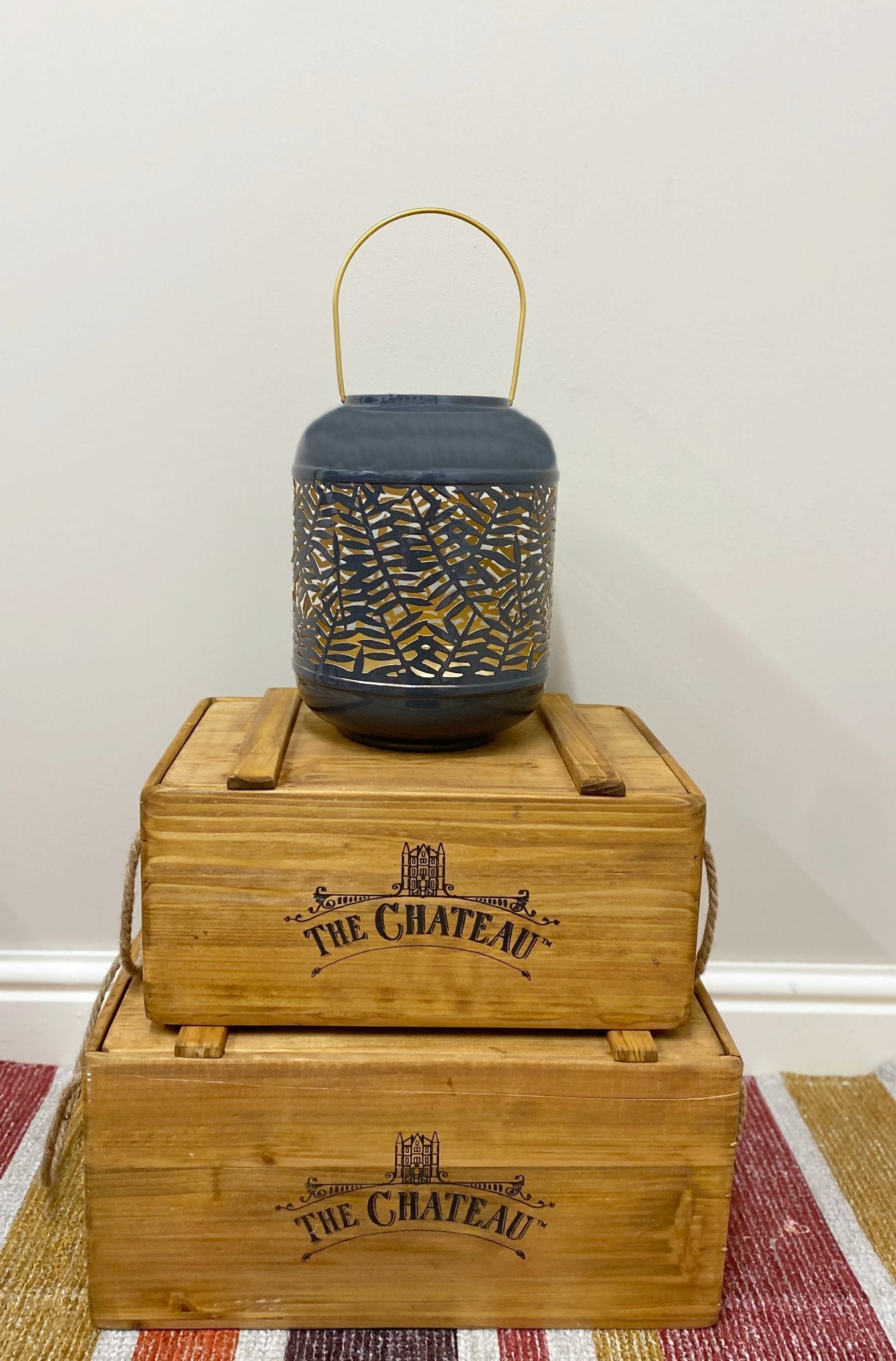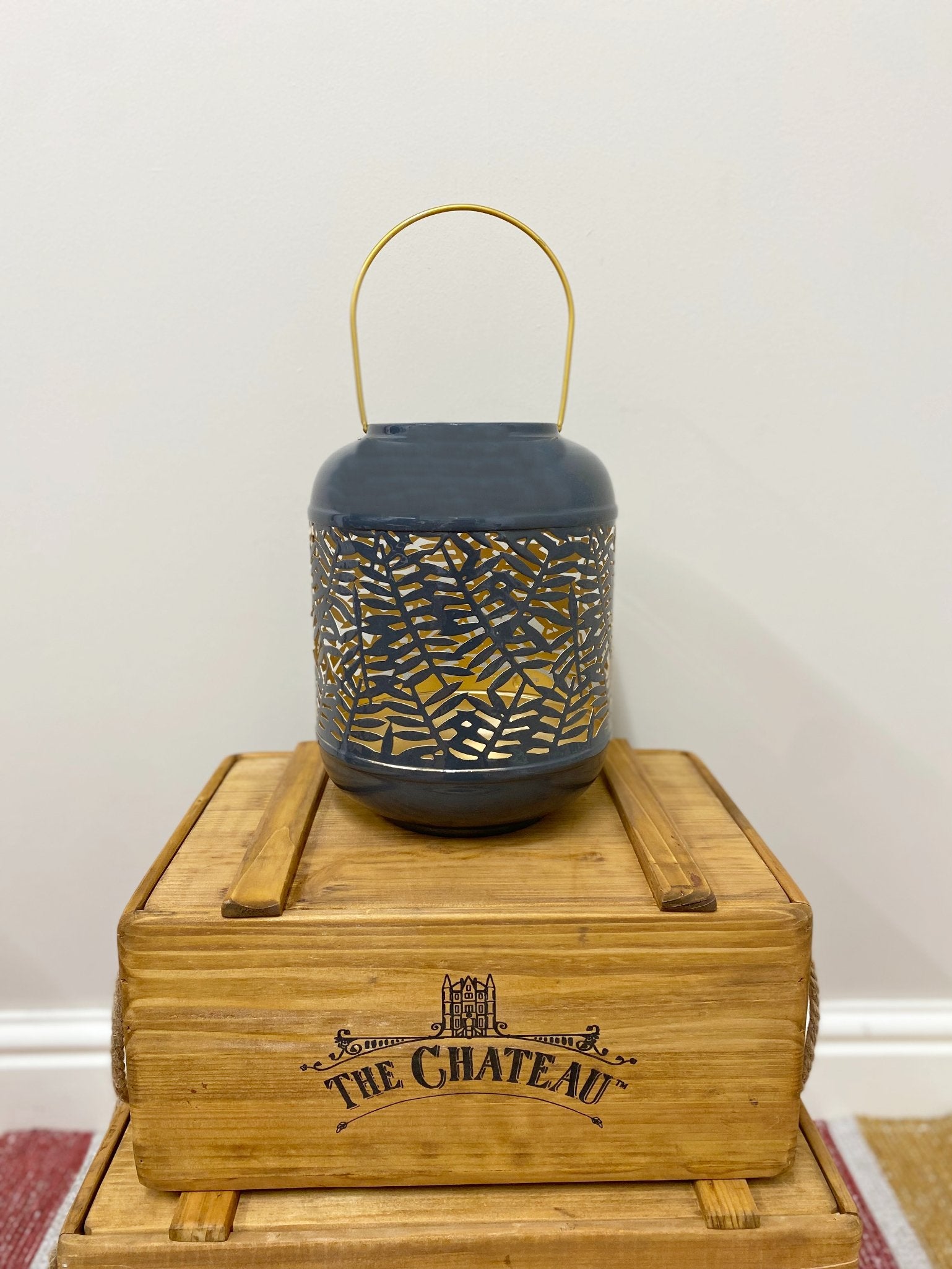 A very attractive metal lantern with carved out leaf pattern around the middle to create beautiful dancing shadows from the inner glow of a pillar candle, which is not included. The finish is a highly polished smokey grey finish on the outside with a gold inner and folding handle. The lanterns base diameter is 12cm with a height of 23cm. The handle is 13.5cm deep. Measurements: D20 x H37 x W20cm