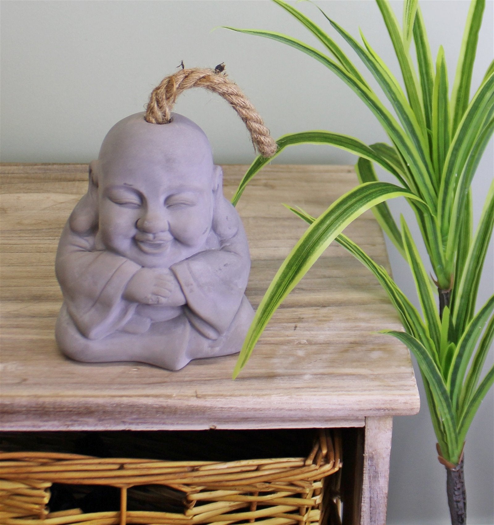 A smiling buddha doorstop made of cement, although small this is a very heavy doorstop to hold all doors open. The doorstop is made of moulded cement with protective pads on the base to protect your floor and a jute handle. Measurements: 10 x 26 x 12cm SKU: BU0029