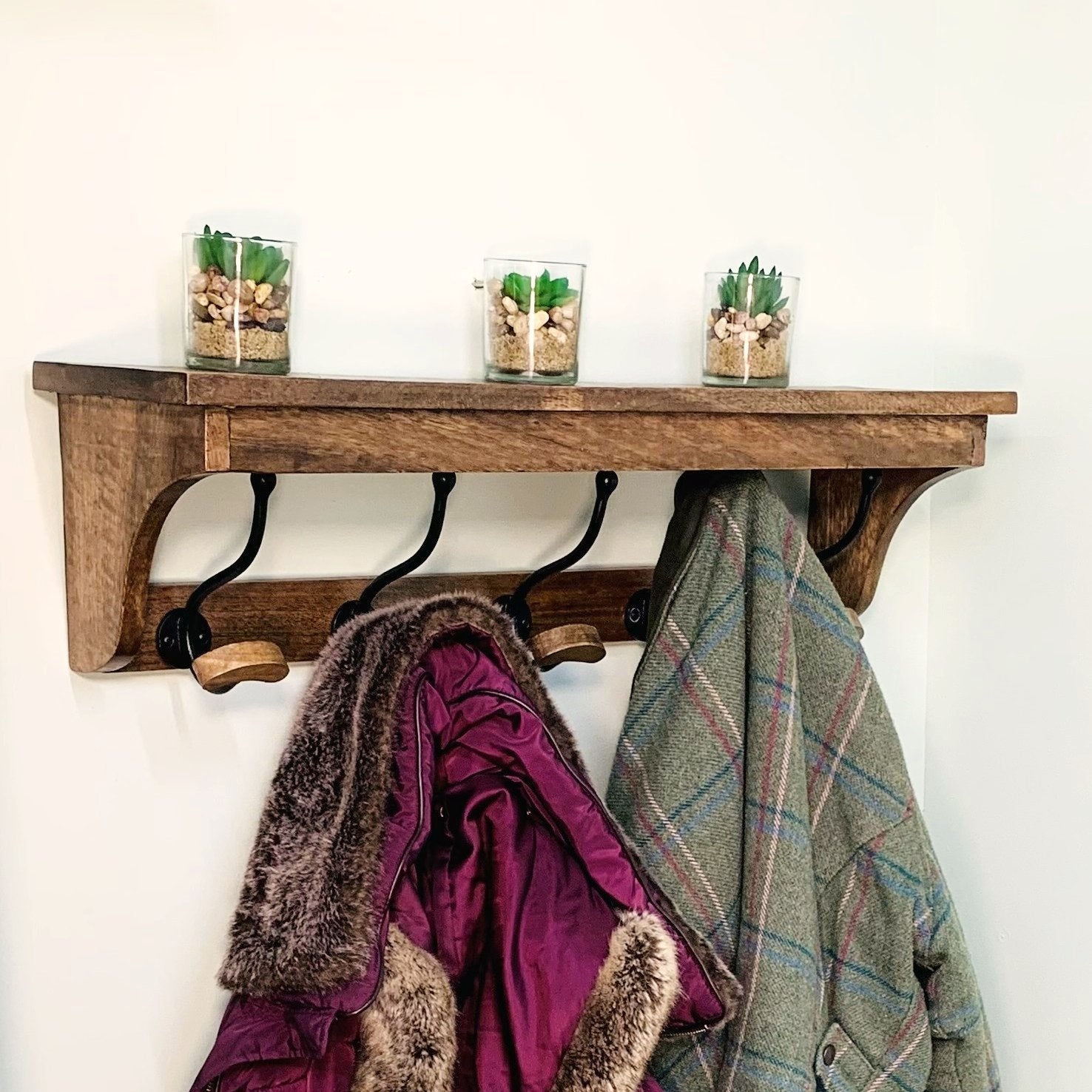 Solid dark wood bracket with 5 hooks. A sturdy product, well made from solid wood. Hooks are 14cm apart, the bottom hooks are 6cm wide. Measurements: W71cm X D17.5cm X H18cm.