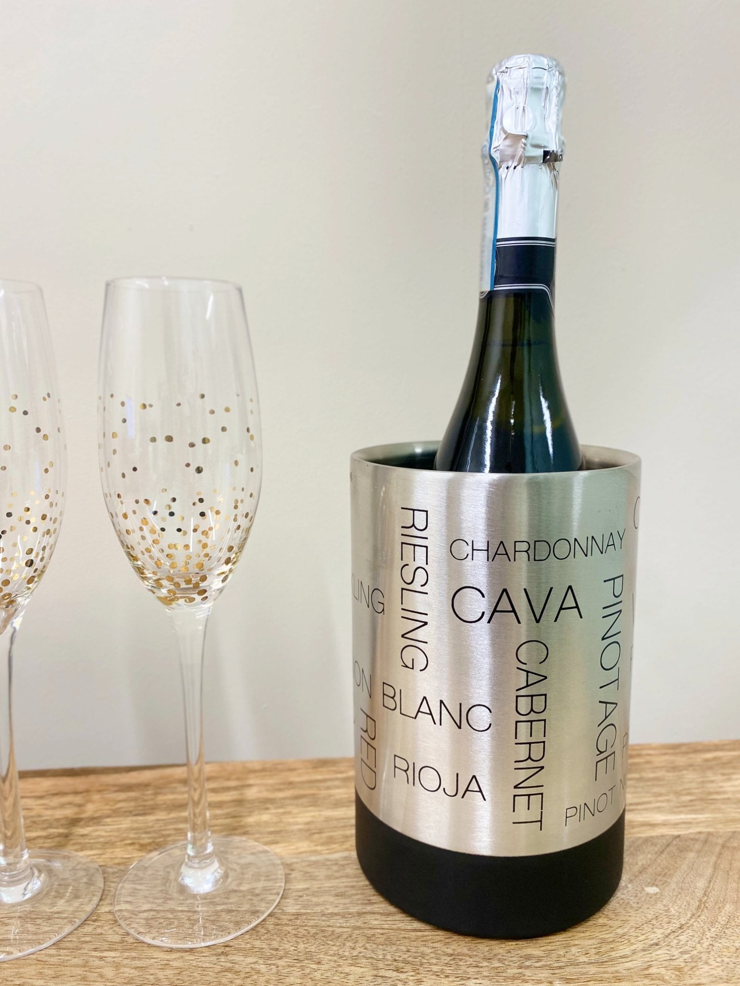 A double walled stainless steel wine cooler featuring names of many of the popular wines. This item has a useful black base that is designed not to slip, serving your wine in style inside your home or garden! Measurements: D12 x H18 x W12cm SKU: KG0784
