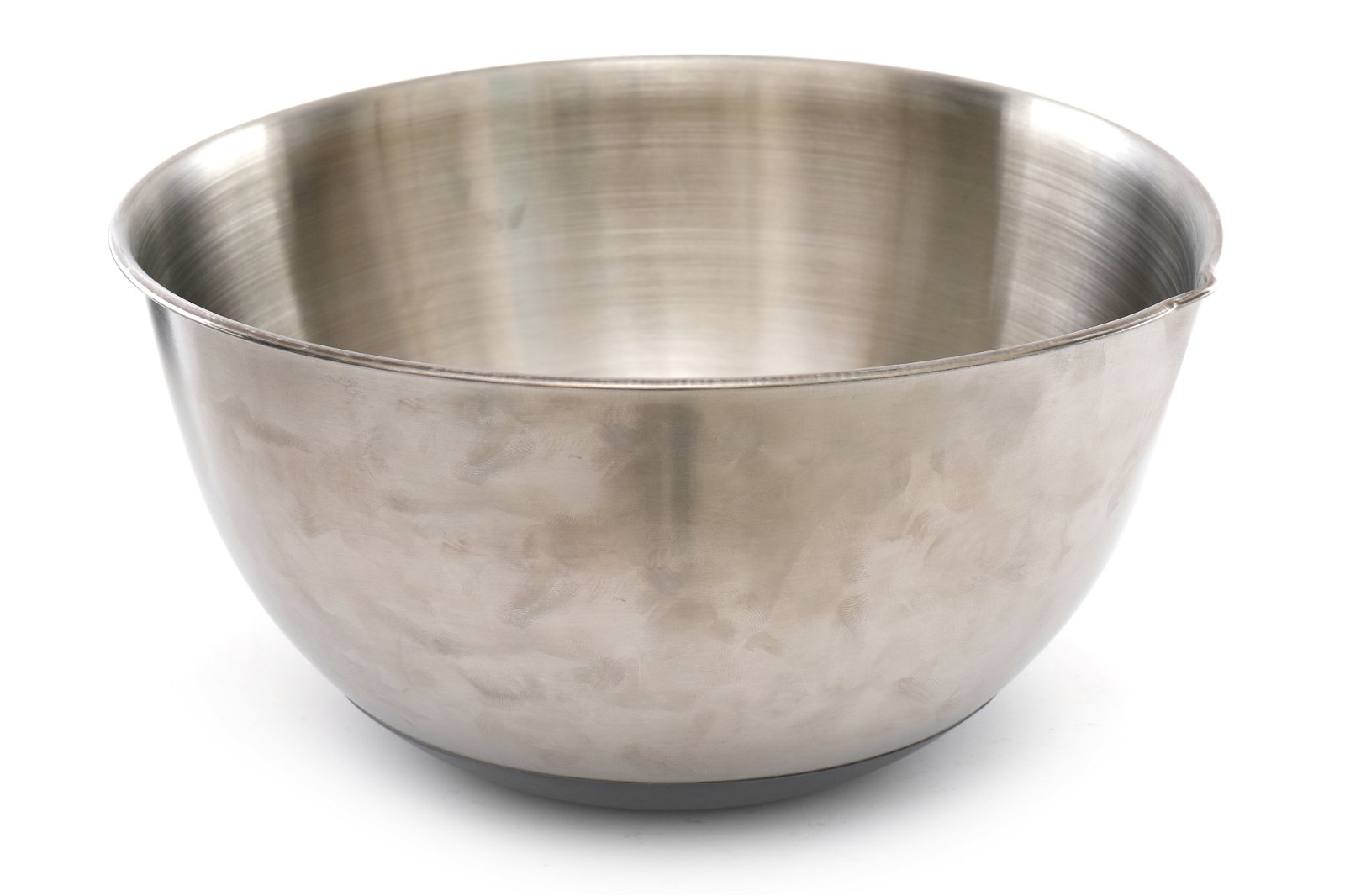 A large mixing bowl made of stainless steel with non slip grey base. This bowl has an internal measuring guide marking for added convenience. This lightweight but sturdy bowl holds 5L and is easy to clean and is dishwasher safe. The non slip base secures and stabilizes the bowl while in use. Measurements: D27 x H14 x W27cm SKU: KG0950