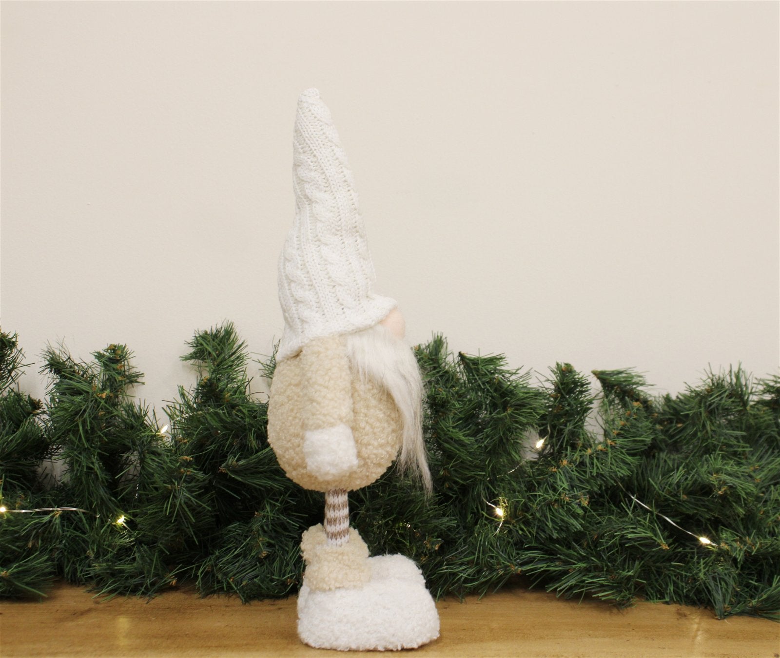 Free-standing Gonk with white knitted hat and boots. The hat is strengthened for support and styling. Measurements: D9 x H34 x W16cm