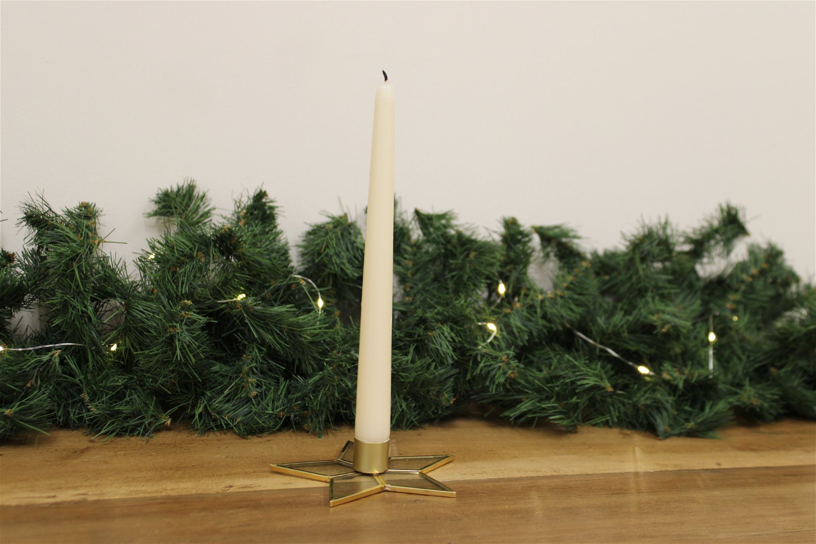 Gold coloured star tapered candle holder. Star made from copper frame, with glass inserts. Measurements: D12.5 x H3 x W12.5cm