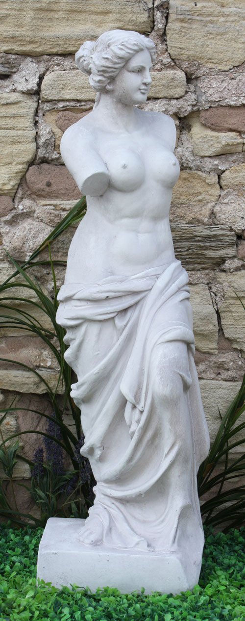 This Italian inspired 'Venus' figure stands 84cm tall and would add a touch of style and grace to your garden. It is made to resemble smooth or weathered stone or marble. Part of our stunning range of Polyresin stone-effect garden ornaments. Built to last and extremely durable. Measurements: 25.4 x 22.9 x 84cm