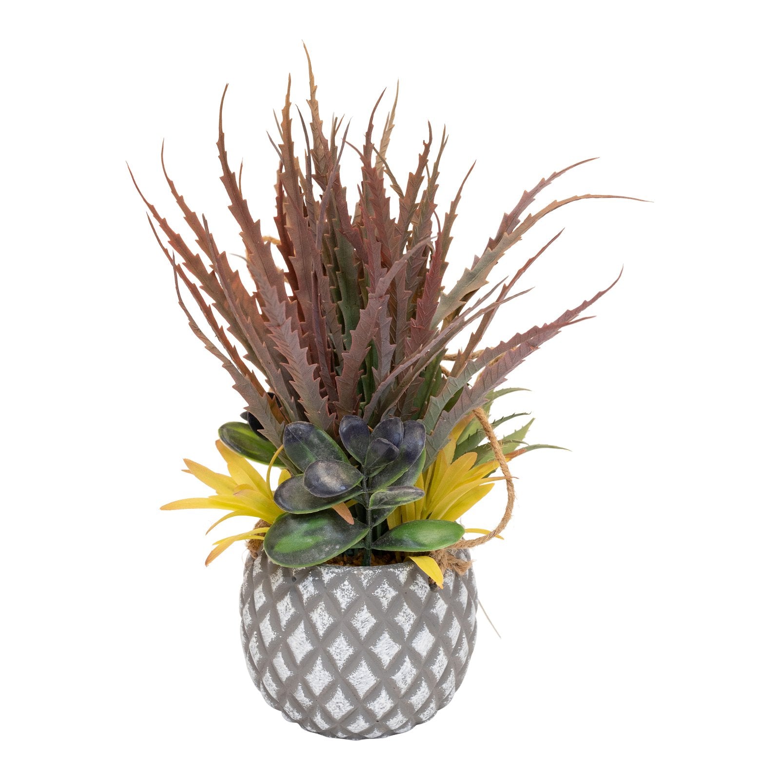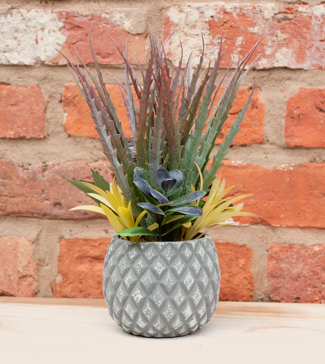 This lattice effect pot with succulents would be perfect as a natural decoration in a living room on a sideboard or in the bathroom on a windowsill. The lattice effect pot is 11x11x9cm and is filled with various artificial succulents. Overall measurements: D21 x H30 x W29cm SKU: FL1195