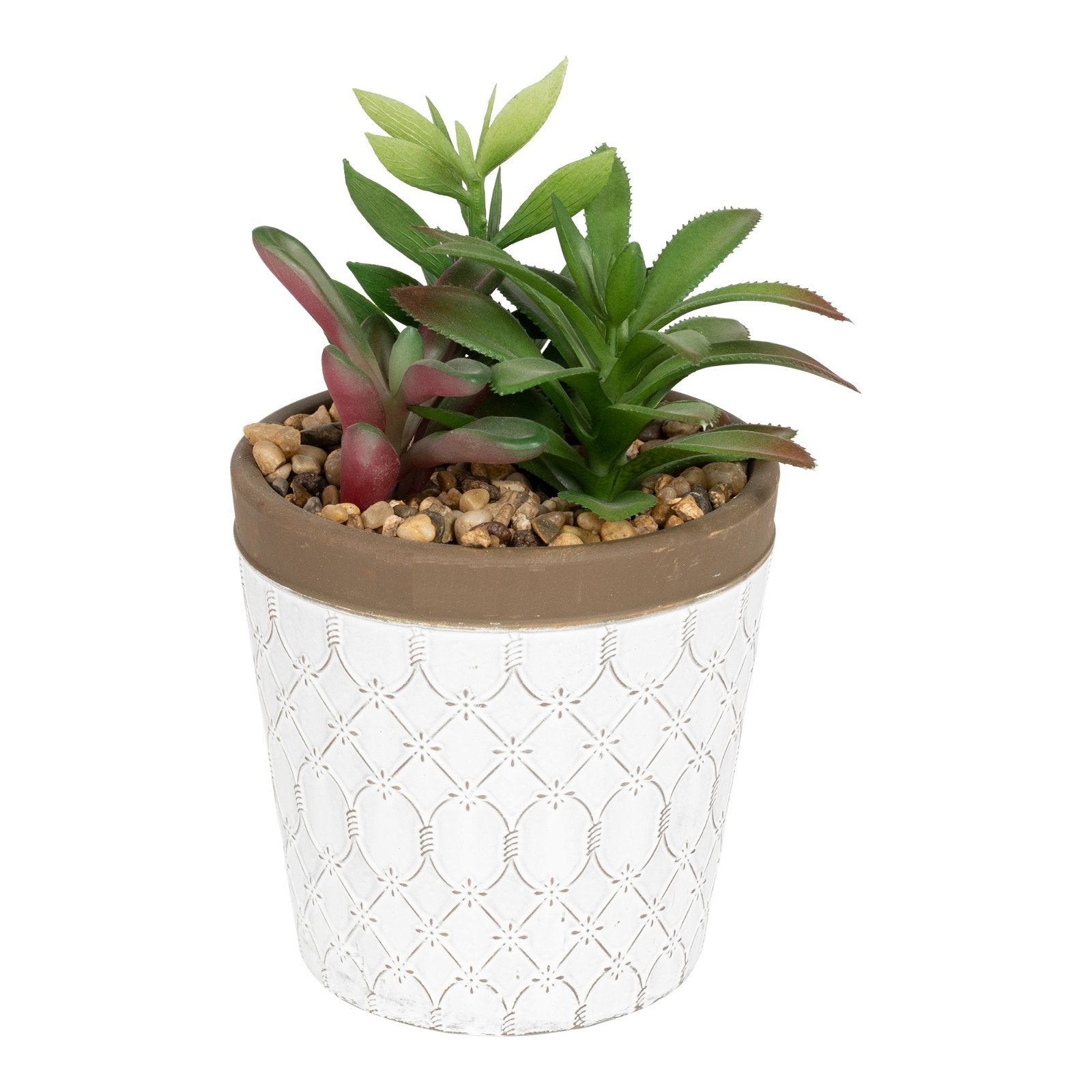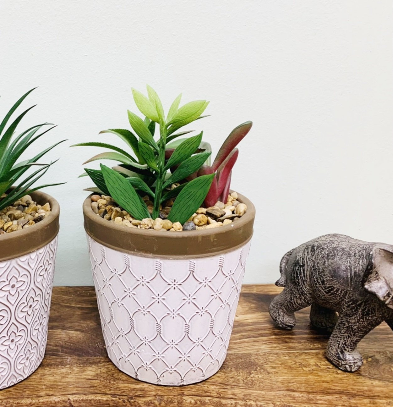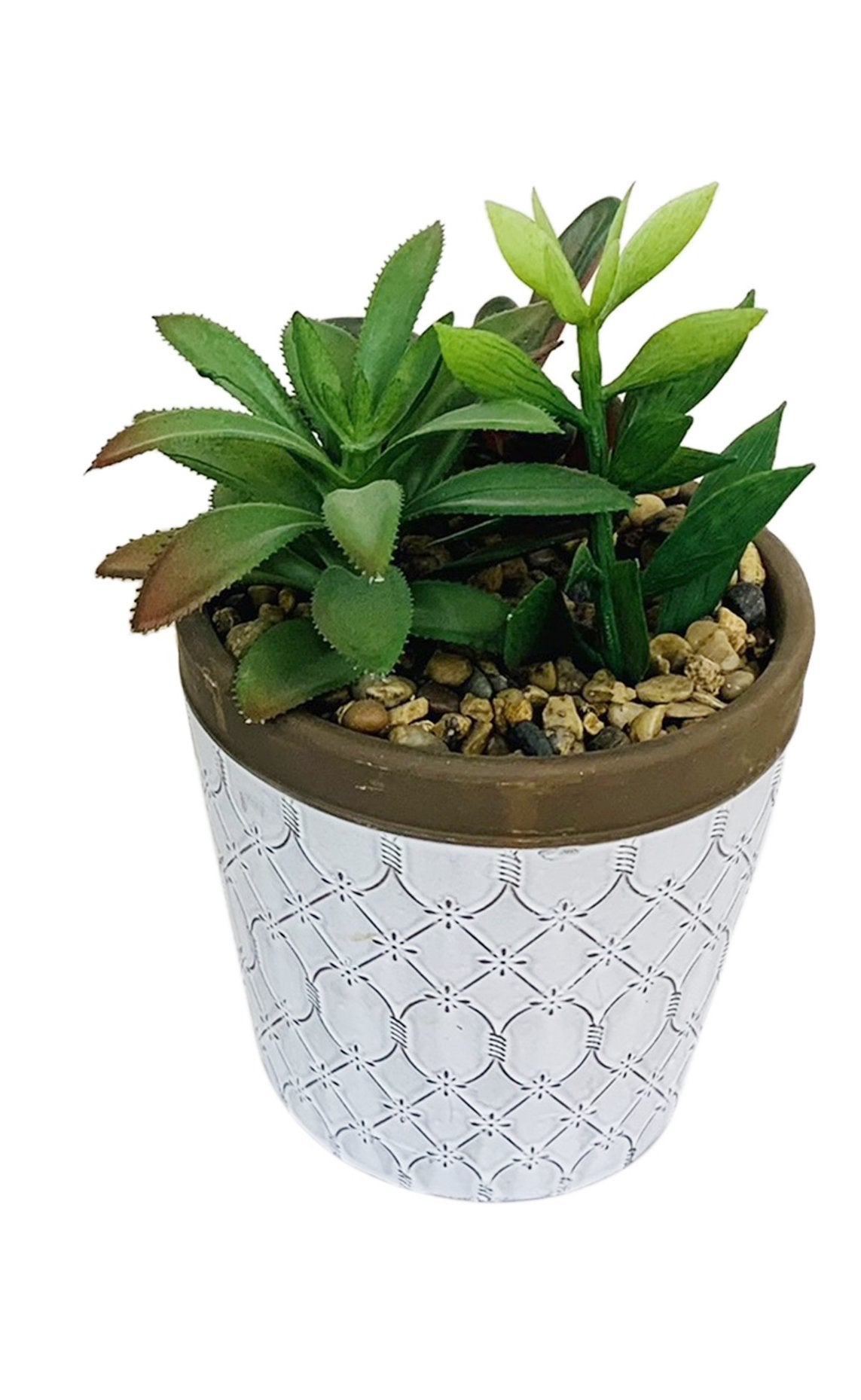 This white terracotta pot with a single faux plant brings nature into the home. The terracotta style pot is 11cm containing one plant. The overall pot and plant measurements are: D12 x H20 x W12cm SKU: SR0081