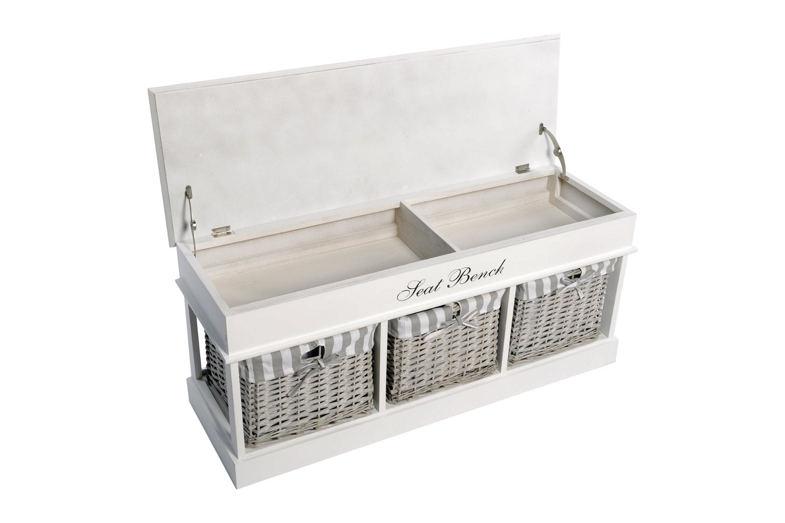 A white wooden seat bench with a shabby chic white finish. This item has 3 useful baskets with a white washed finish, lined in a grey and white striped cotton fabric. The top of the seat/bench is hinged with 2 useful compartments underneath for storage. The cushion has a removable cover made of a striped grey and white fabric.