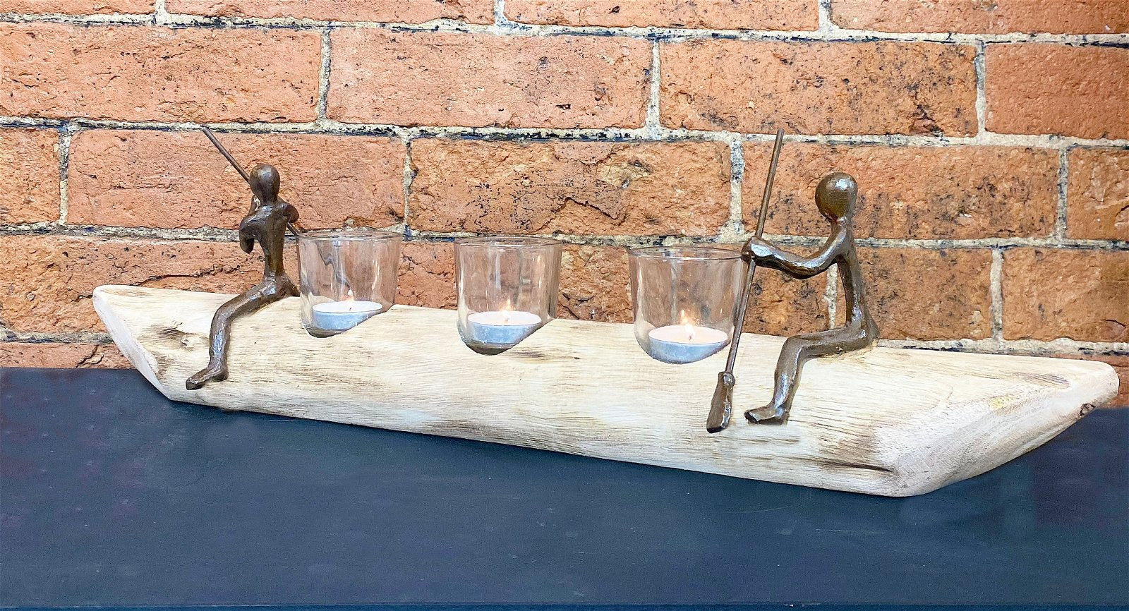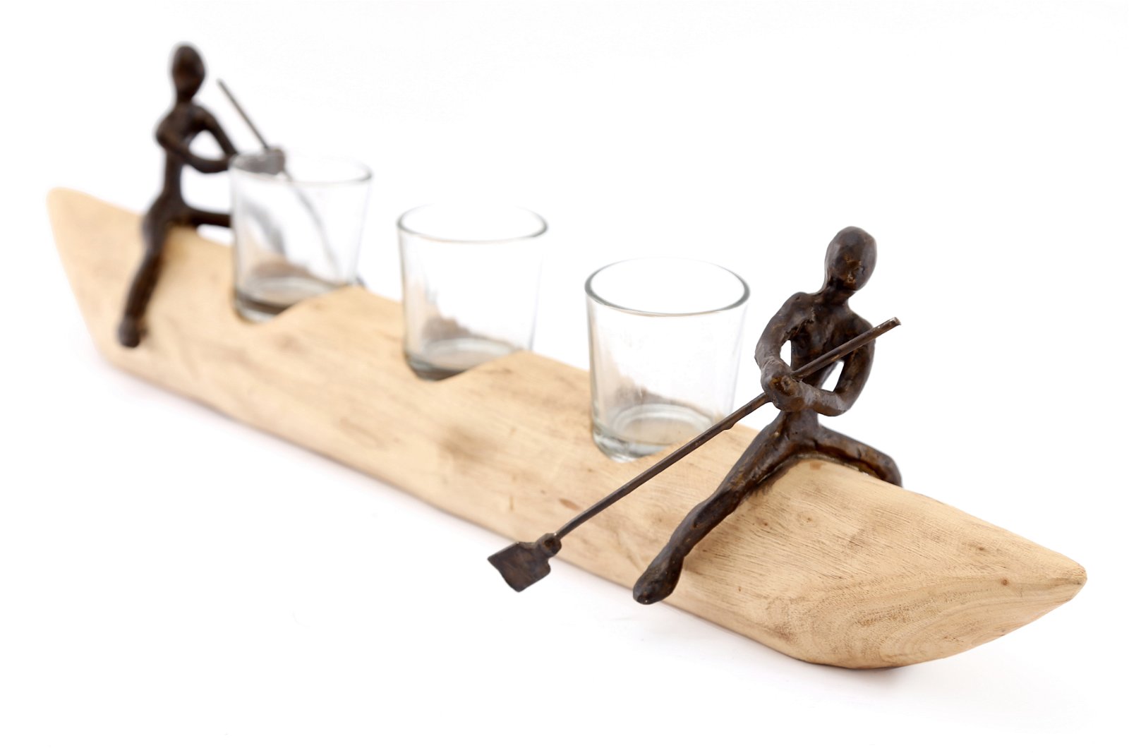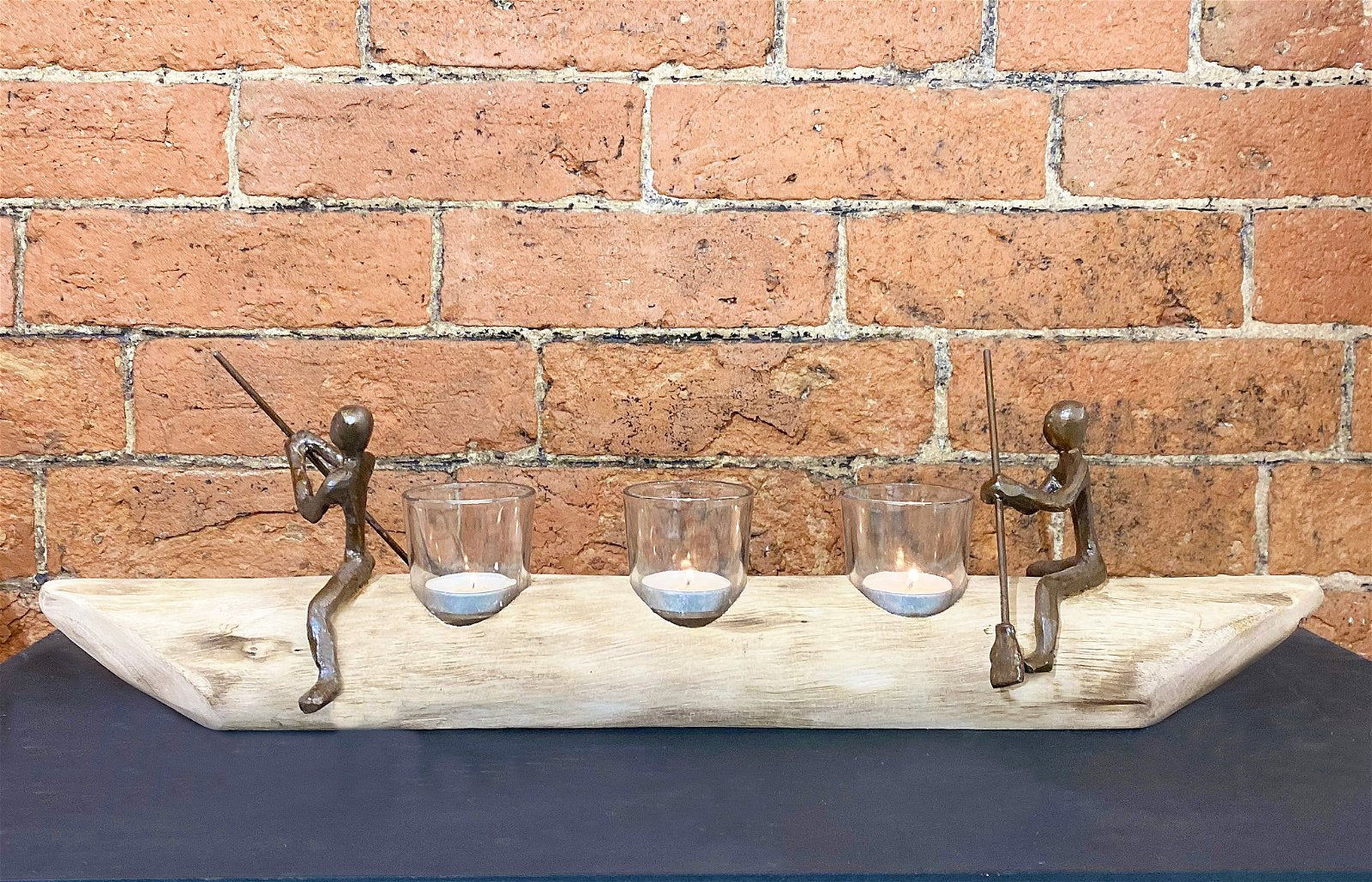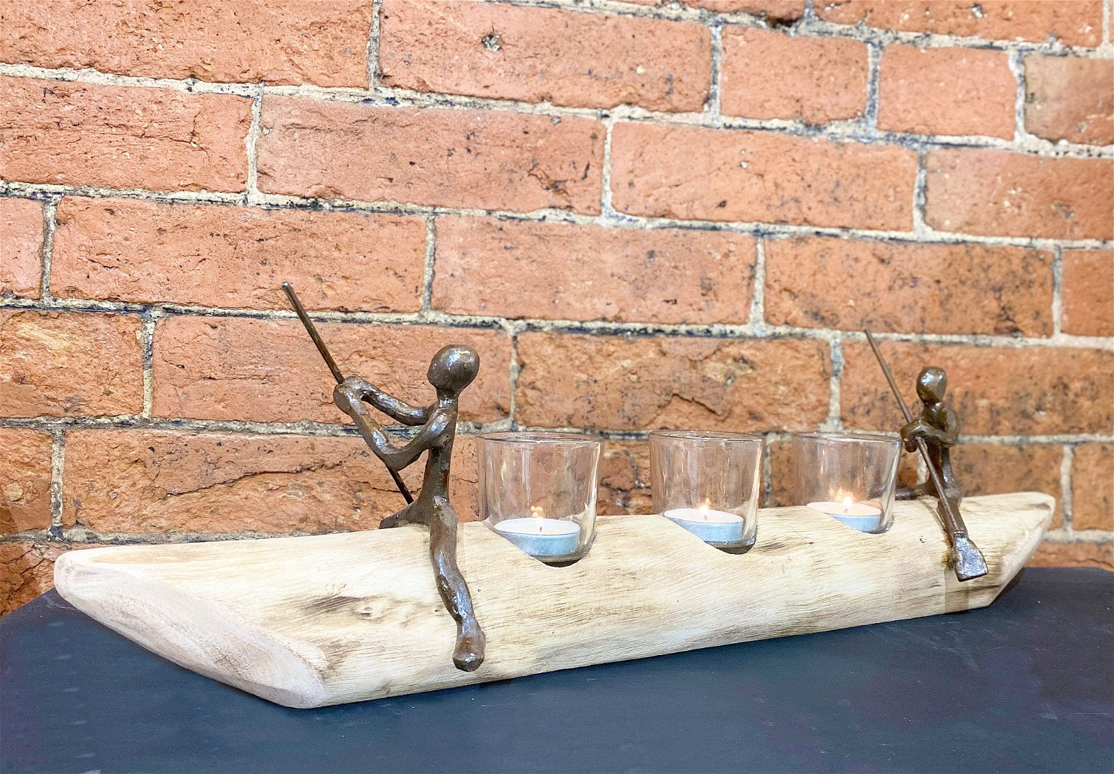 A wooden rowing boat tea light candleholder with metal sculpture rowers with bronze effect. Each piece has 3 glass holders (5cm diameter and height 6cm) which sit neatly in a cut out slot, 4cm apart. Measurements: D17 x H20 x W60cm