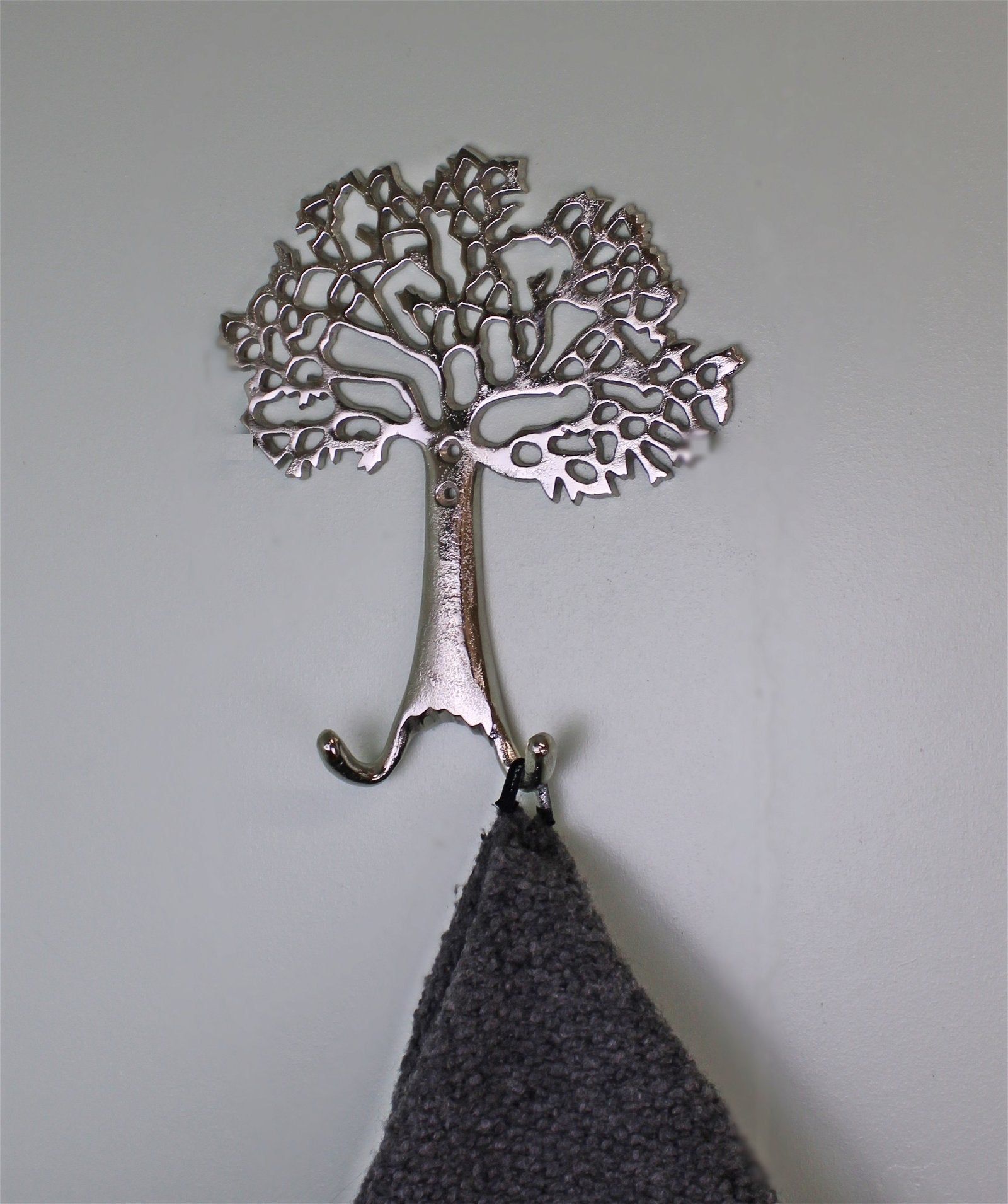 A stylish coat hook in our ever popular tree of life range, there are 2 hooks ideal for hanging coats. Made of 100% aluminium the item has 2 holes for easy fixing to the wall. Measurements: 3.5 x 27 x 23cm SKU: OR1473