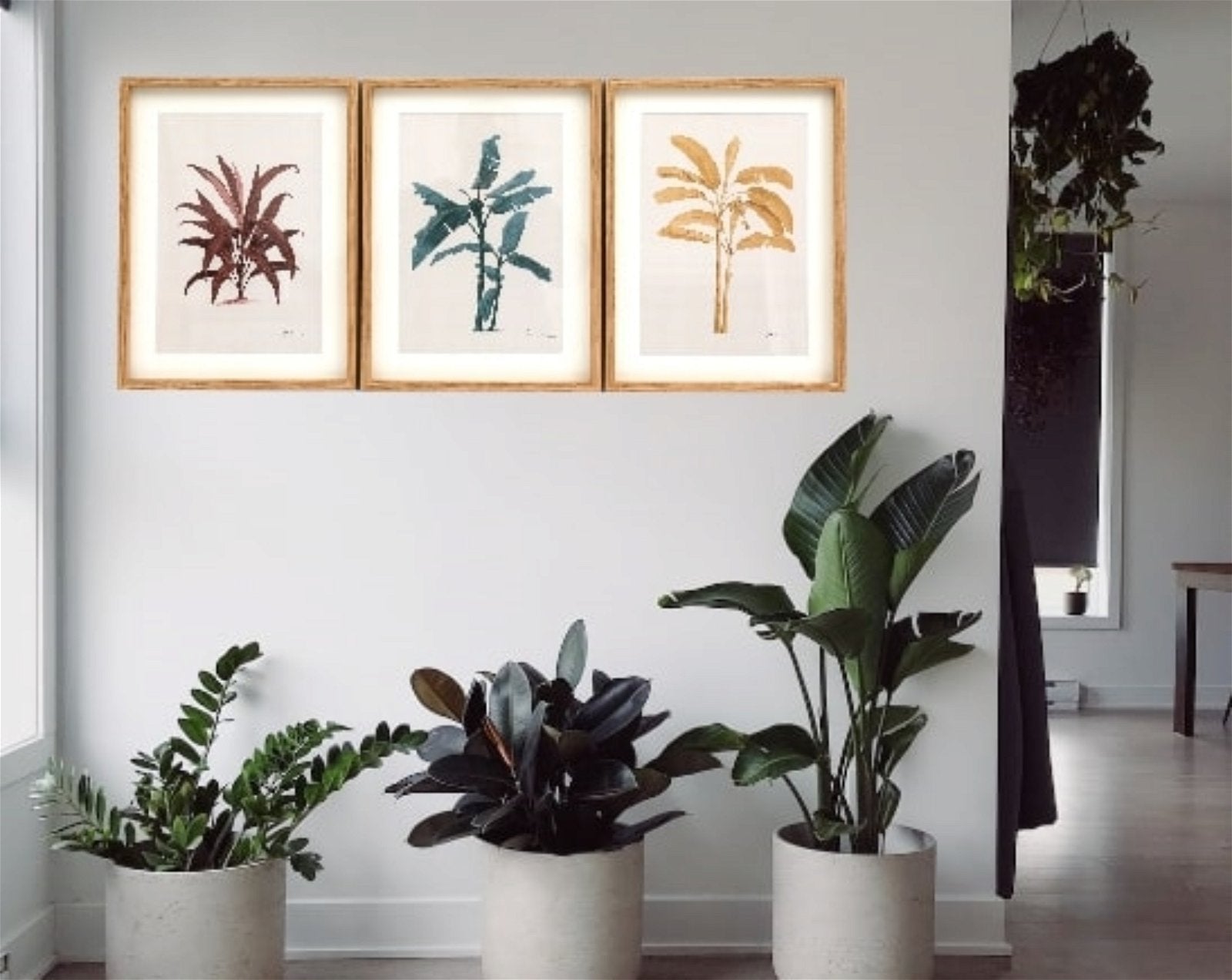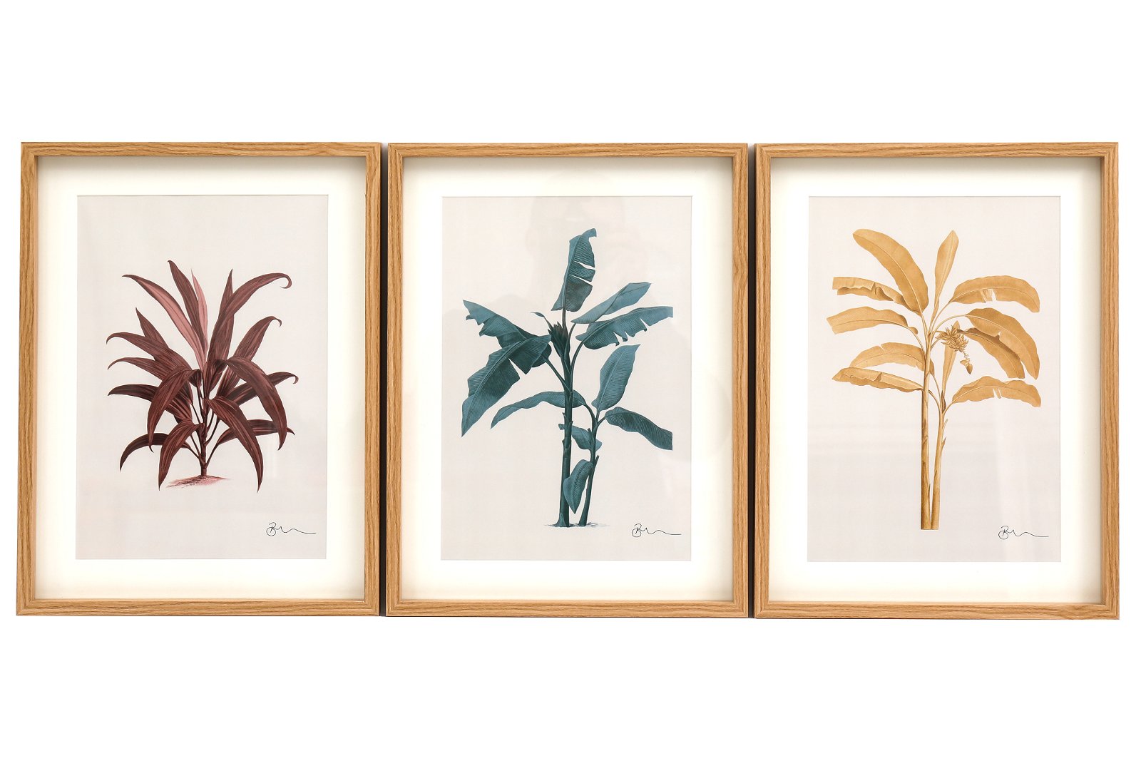 Set of three tropical leaf prints, in wooden frames. Can be displayed free-standing or wall hanging. Measurements: D2.5 x H41.5 x W31.5cm