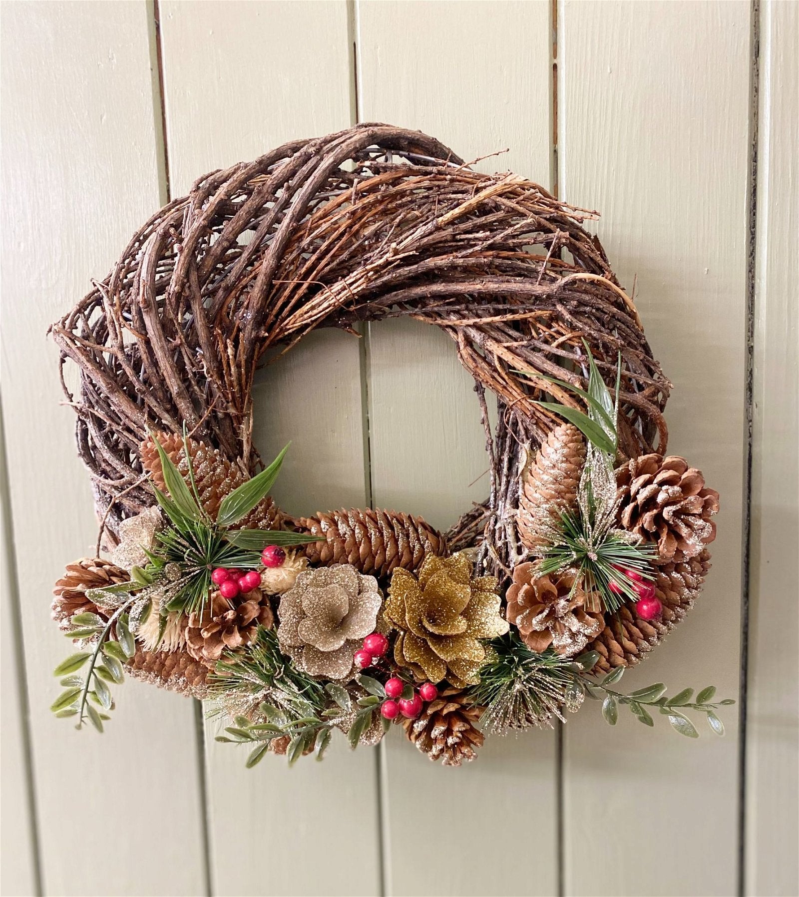 This wreath is handcrafted from all natural forest pieces. The twisted pine tree twigs are woven within the wire frame with the bottom half dressed with festive cones, Christmas flowers and greenery, lightly dusted with glitter. This is truly a beautiful wreath that would enhance every front door. The wreath is approximately 36cm diameter with collar depth of 13cm. Overall measurements are: D12 x H34 x W35cm