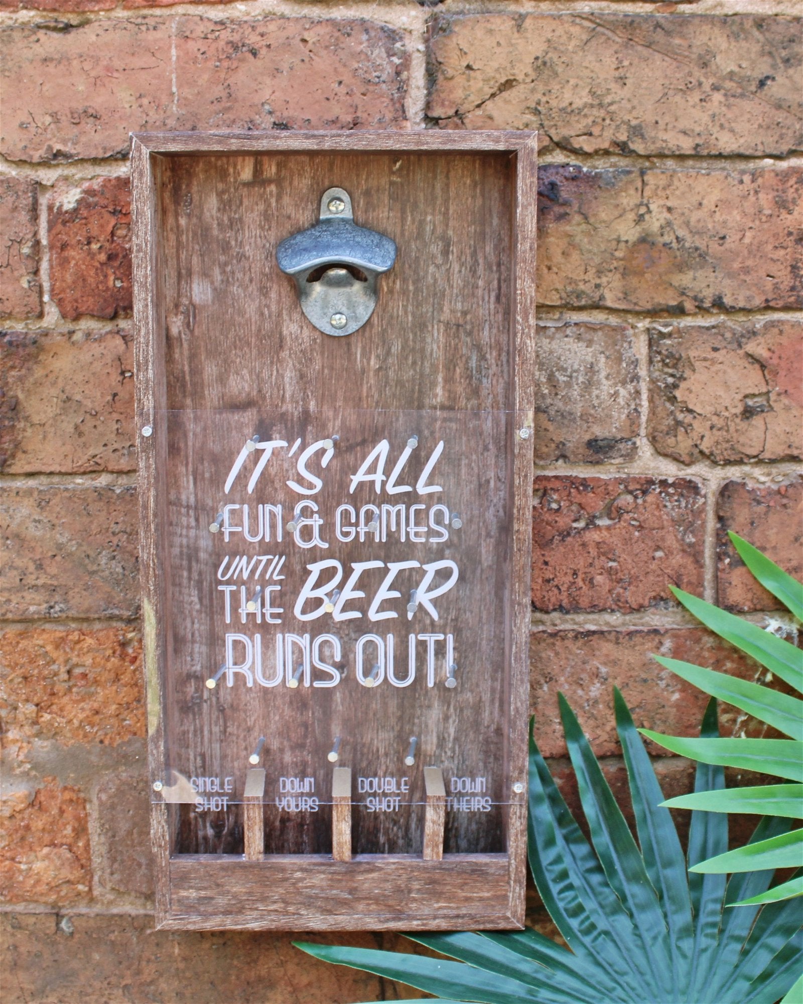 Drinking game: liven up your parties with this smashing drinking game. Players take turns opening their beers and watching as the metal cap falls to their fate; single shot,dare me,double shot,down yours,truth time,down theirs. Fabulous party piece! Perfect for house parties, BBQs! Great item to have a good drinking game with friends and family. All brackets allow you to mount the game board for play anywhere. Includes integrated bottle opener. Made of MDF. Measurements: 5 x 40 x 19cm SKU: KG0747