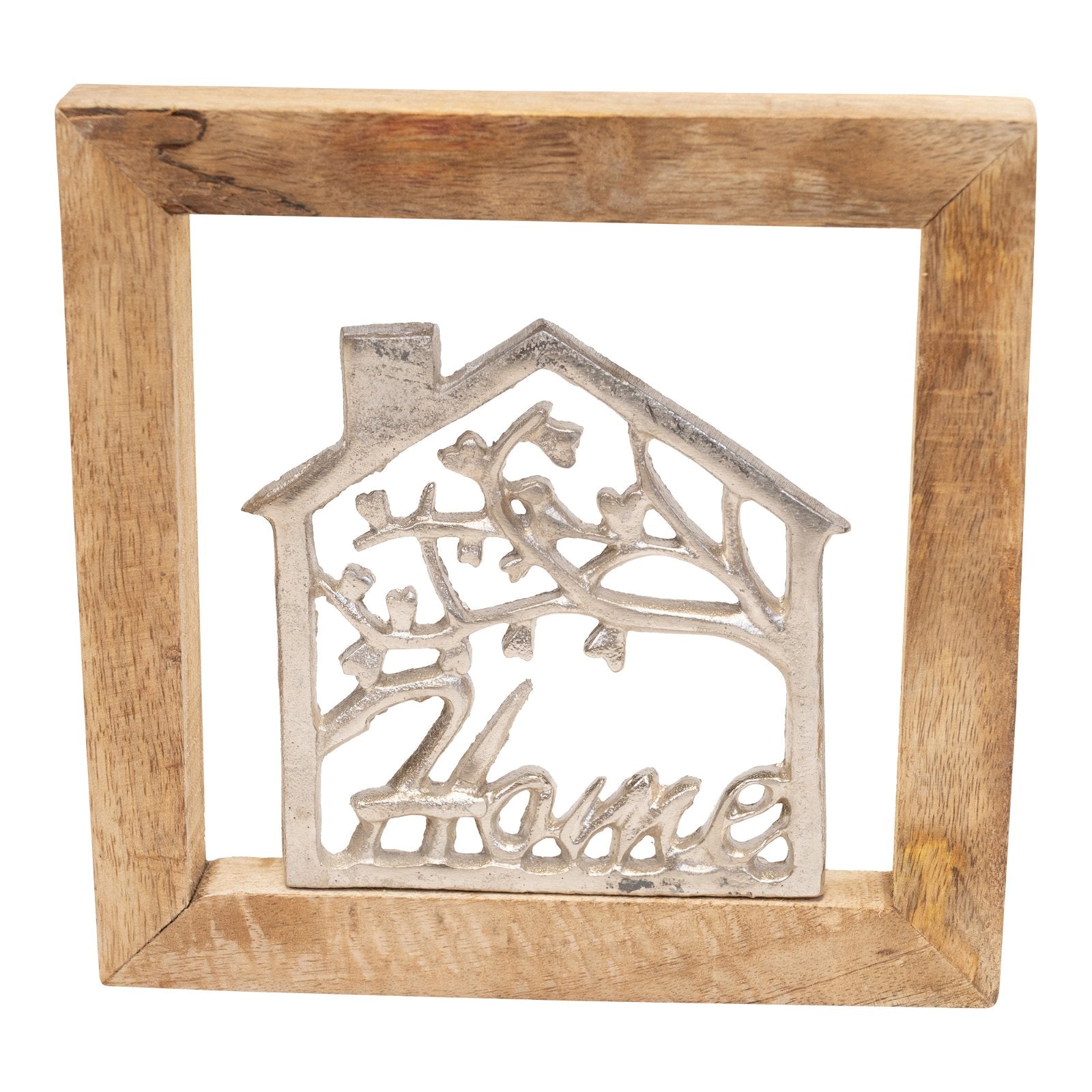 A natural coloured wooden frame with silver coloured house sculpture with home insert. This would be the perfect gift to a new proud homeowner. Wooden wall hanging frame with metal House and home insert. The frame width is 2.5cm. Overall measurements are: D30 x H2 x W30cm SKU: OR1734