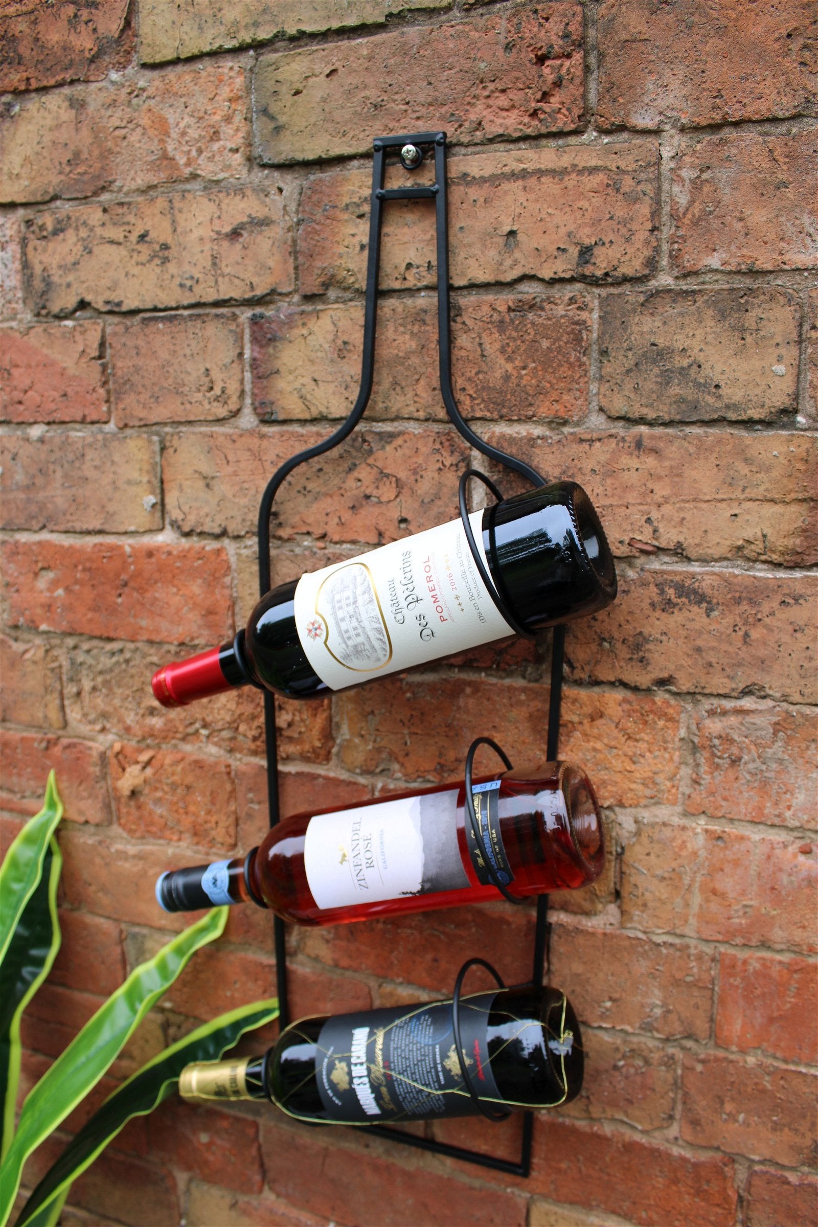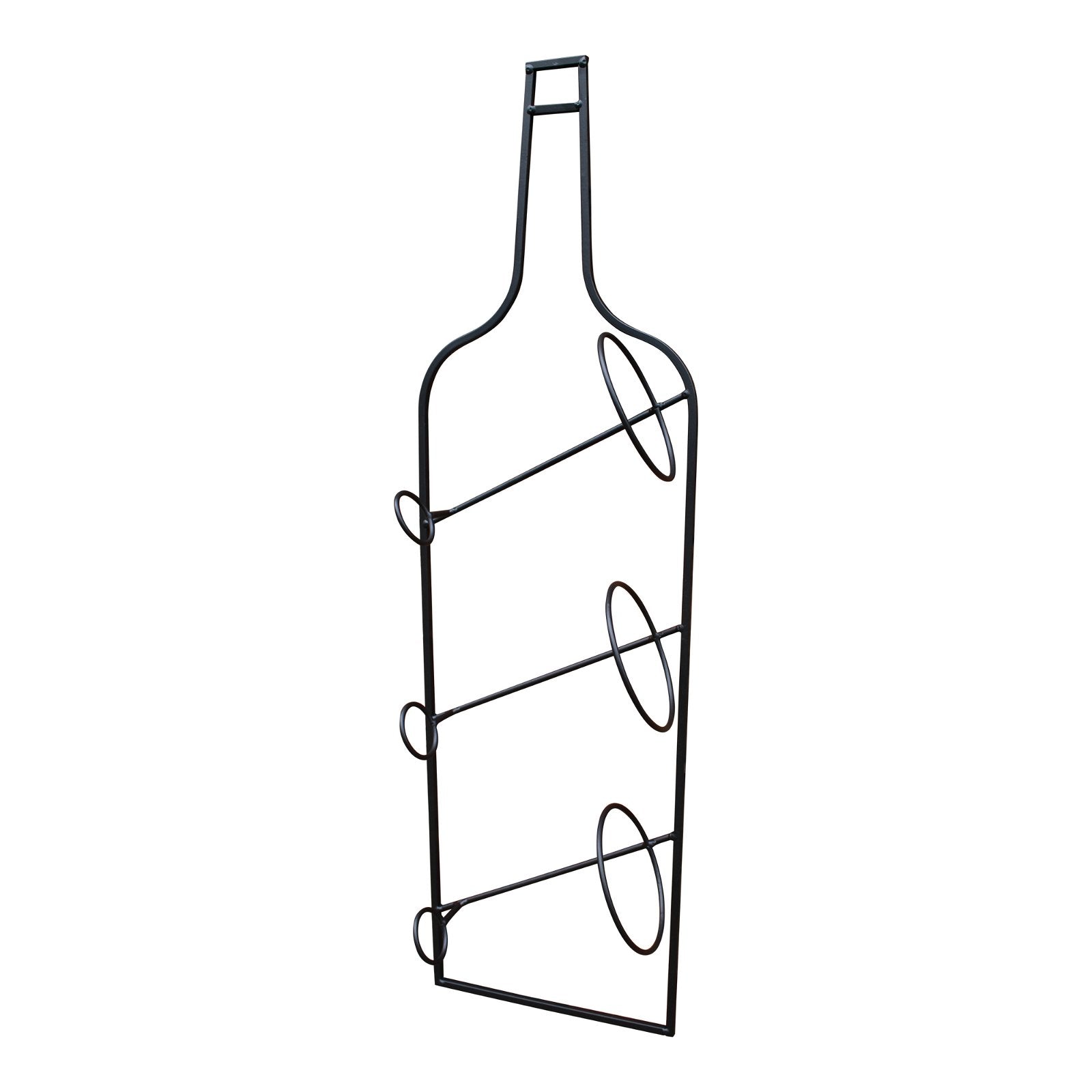 A wall mounted black metal wine bottle holder in the shape of a bottle. A stylish and simple storage solution. Space to store 3 bottles of wine, conveniently hung on your wall. Measurements: 10.5 x 70 x 20.5cm