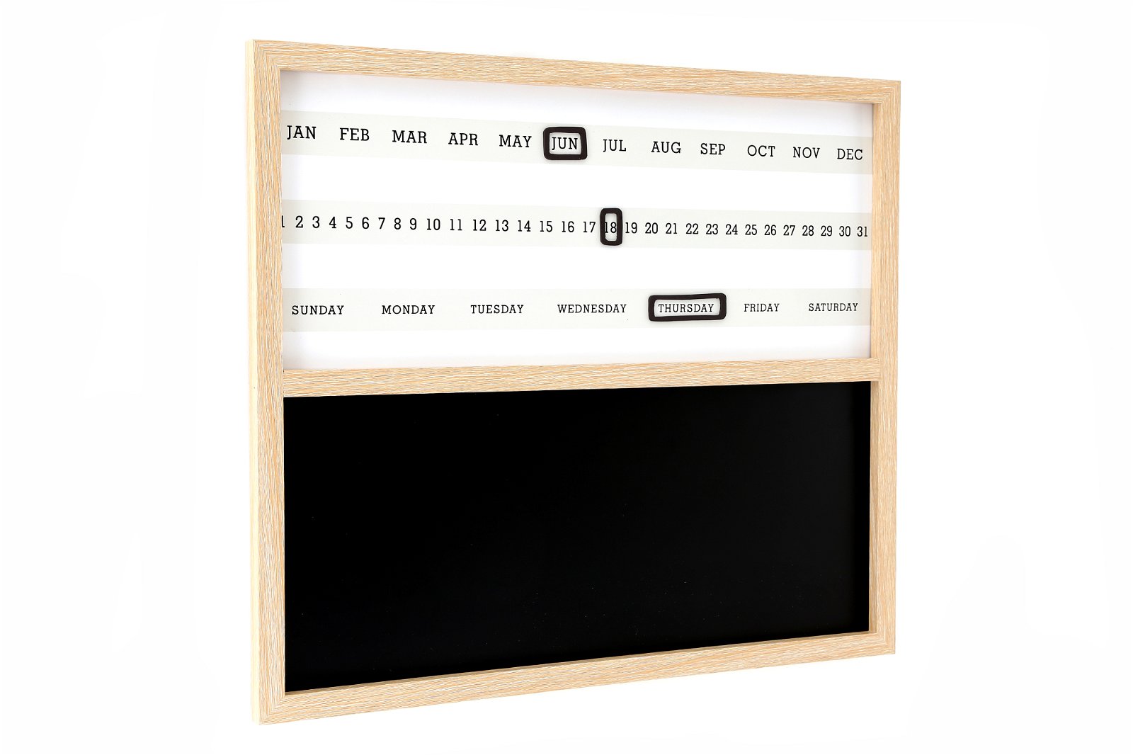 A hanging wooden framed dual purpose item, the top half used to depict month, date and day. The bottom half a chalk board. Movable magnetic windows which highlight the current date are set on a clear background 50.5cm x 20.5 cm. Below which sits a chalkboard area useful for reminders, memos and messages. Overall measurements are: D47 x H2 x W54cm SKU: KG0911