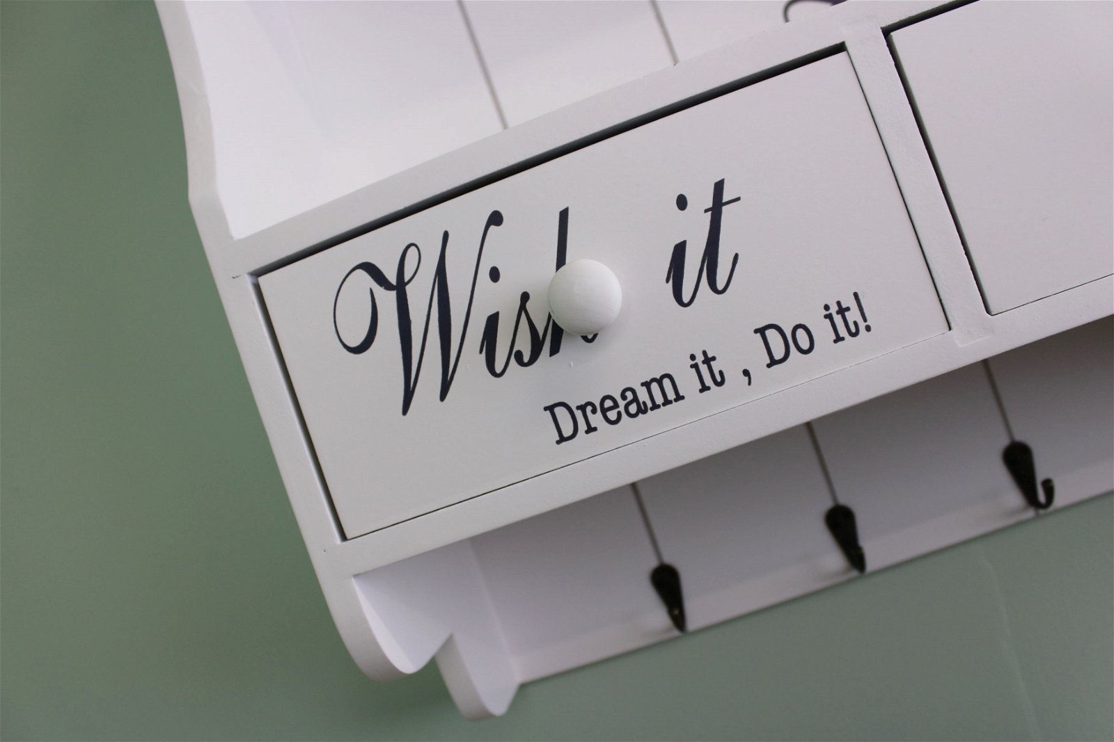 This is just one of our beautiful wall units. A vintage country style shelving unit with 3 drawers for storing little bits & bobs. This would look perfectly at home in a country cottage. In a beautiful white painted finish that will stand out against any wall and comes fully assembled. Comes complete with 2 beautiful quotes printed onto the unit. Along with the drawers, this unit has 2 shelves that offer a great storage solution and safe place to display ornaments and accessories and 4 hooks for hanging coats, towels or bags from. Perfect for use in the kitchen, bathroom, bedroom or hallway, this will match a country cottage style decor and add some vintage charm. In a solid and sturdy design, made from wood and painted in a crisp white colour with tongue and grooved backing. Measurements: 18 x 50 x 50cm. Internal shelf height 27cm.
