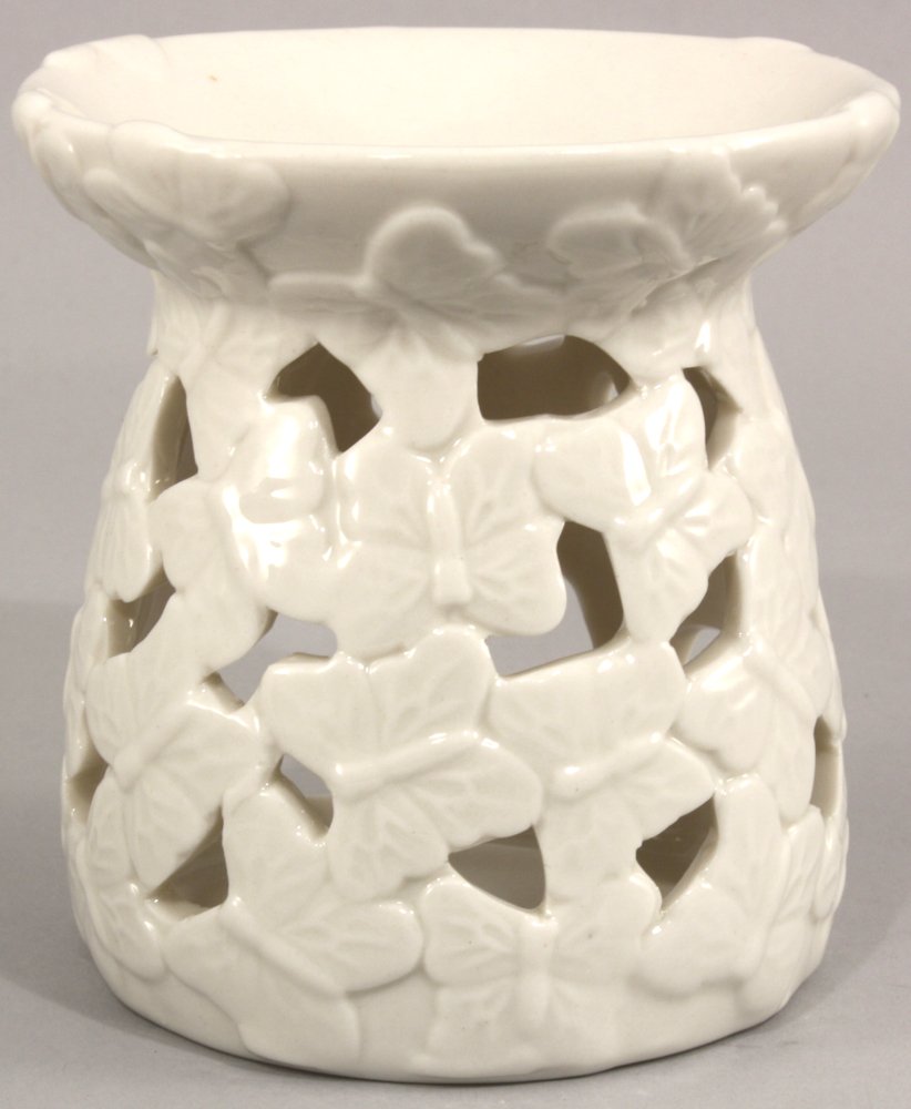 A Beautiful yet simple white ceramic oil burner with an embossed butterfly design Burn your favourite scented oils in style, perfect for your home or as a gift for a special friend Measurements: 10 x 10 x 10cm SKU: FR0026