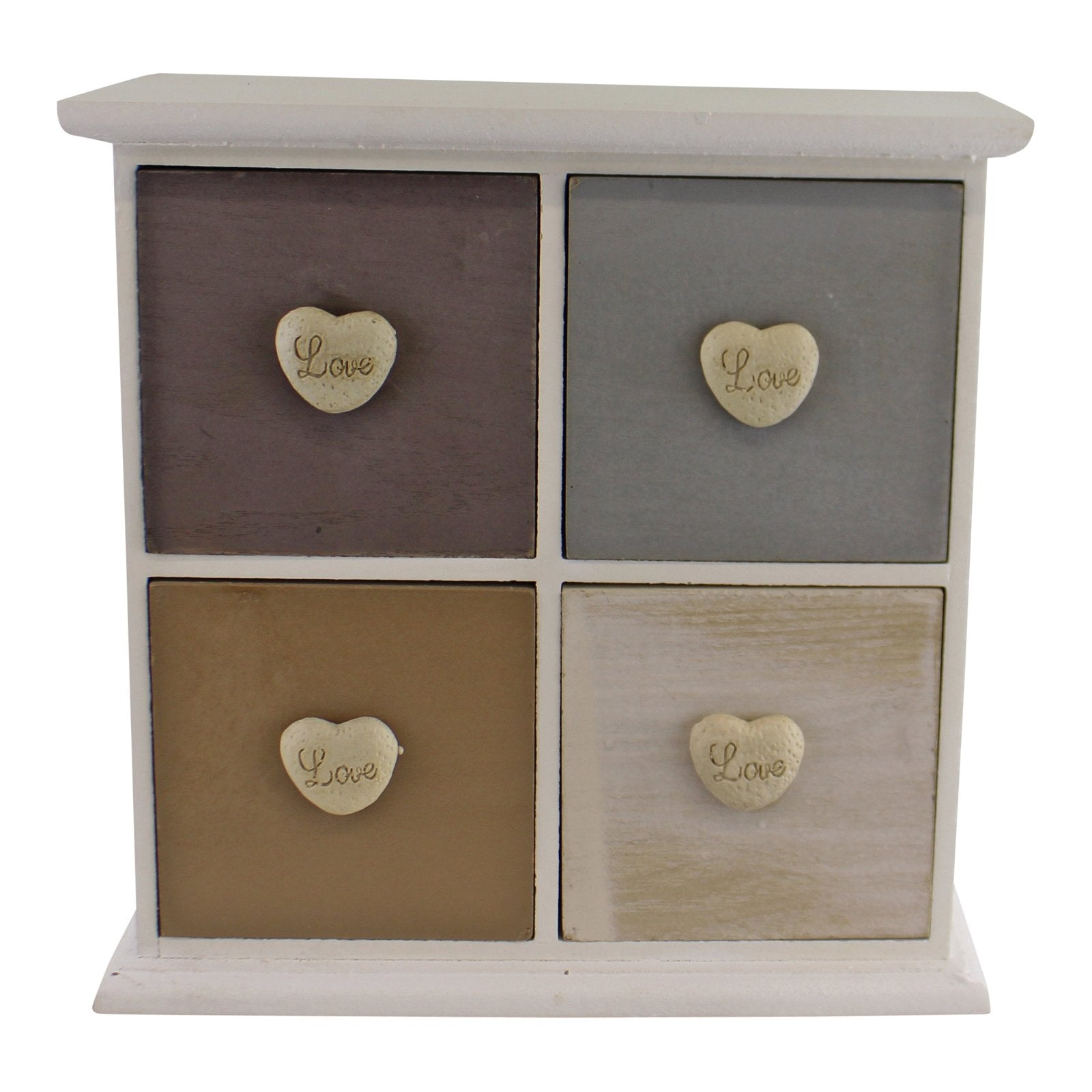 A lovely set of trinket drawers in a neutral colour scheme with 4 drawers featuring love heart design drawer handles. Made of MDF and Firwood. The drawers internal measurements are W8.5 D7.5 H8cm. Measurements: 10.5 x 24 x 24cm