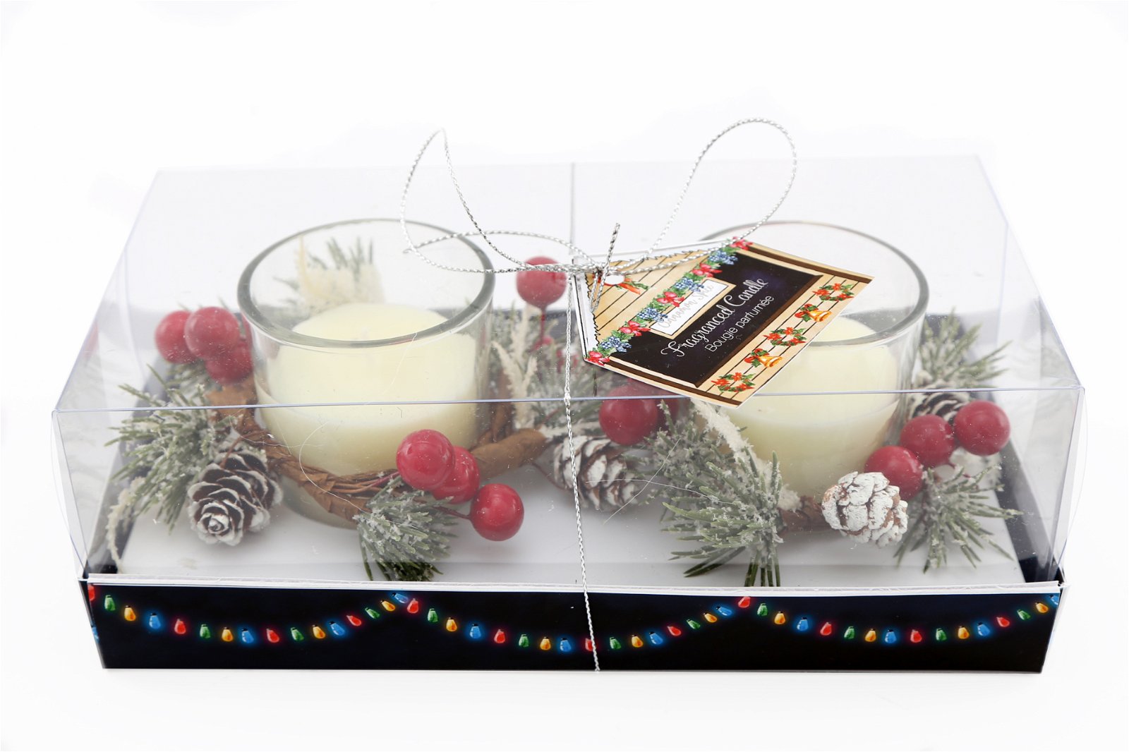 A set of 2 glass candle pots including a white candle with the scent cinnamon spice. An attractive centre piece or decoration for any Christmas table. Two glass pots each with a wreath of berries, leaves and pine cones dusted with artificial snow. These have a diameter of 5.5cm and a height of 6.5cm. These are gift boxed. Overall boxed measurements: D10 x H6.5 x W20cm