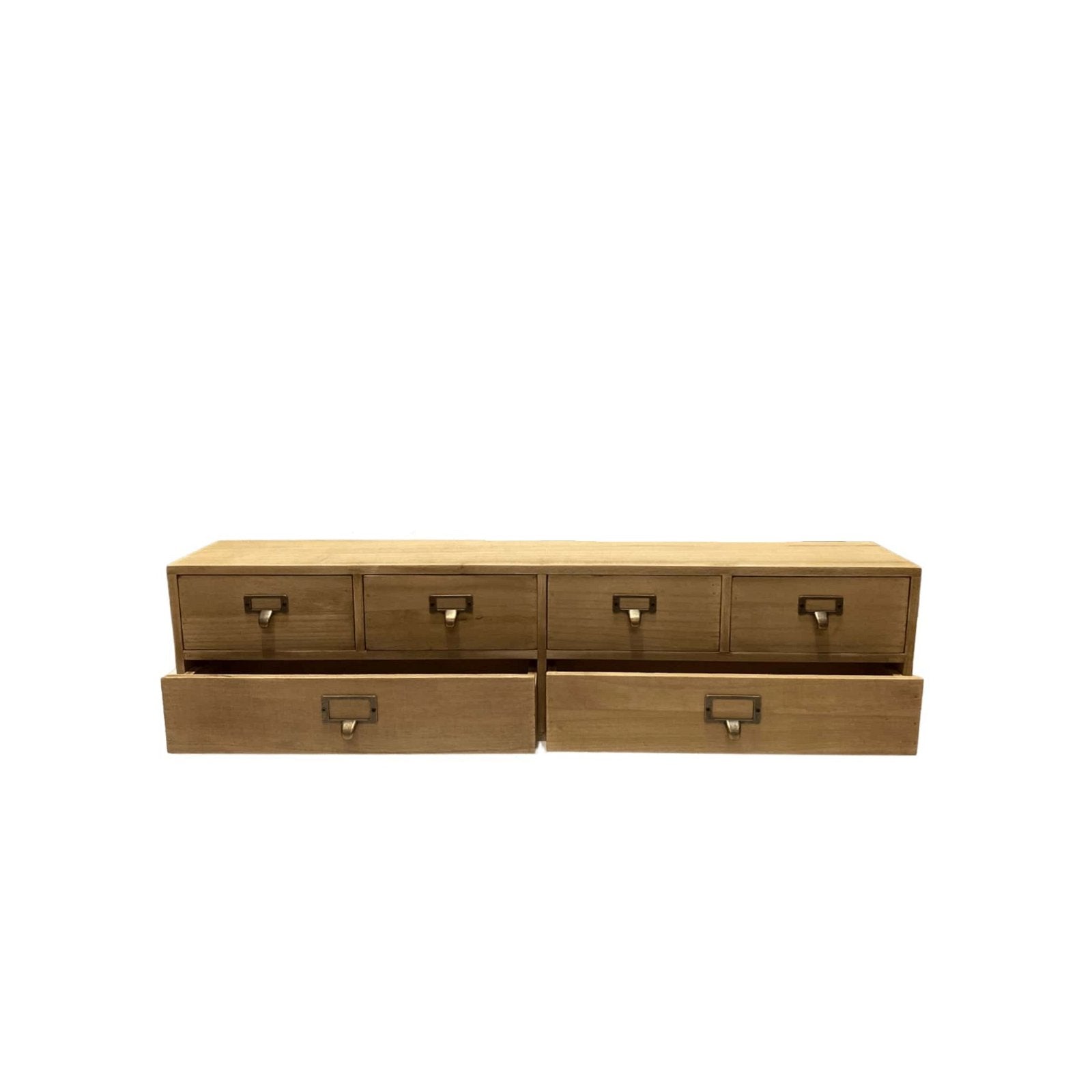 Long wooden desk top or wall hanging cabinet with 6 drawers. A well made wooden cabinet with 6 drawers, 4 smaller ones above 2 long ones. All the drawers open with a metal handle with space to label the contents. This item measures: width 80cm, height 20cm and depth 15cm. The top 4 drawers internally measure 11.5cm deep x 16.5cm wide x 7cm high. and the larger bottom drawers measure 11.5cm deep x 36cm wide x 7cm high. The small nameplate card insert size is 34 x 16mm with a display area of 31 x 12mm (not included). The large nameplate card insert size is 4.5 x 2.5cm with a display area of 4 x 2cm (not included).
