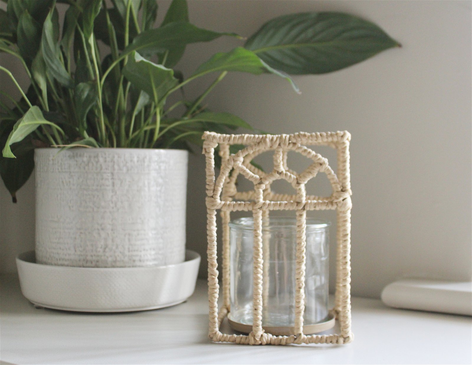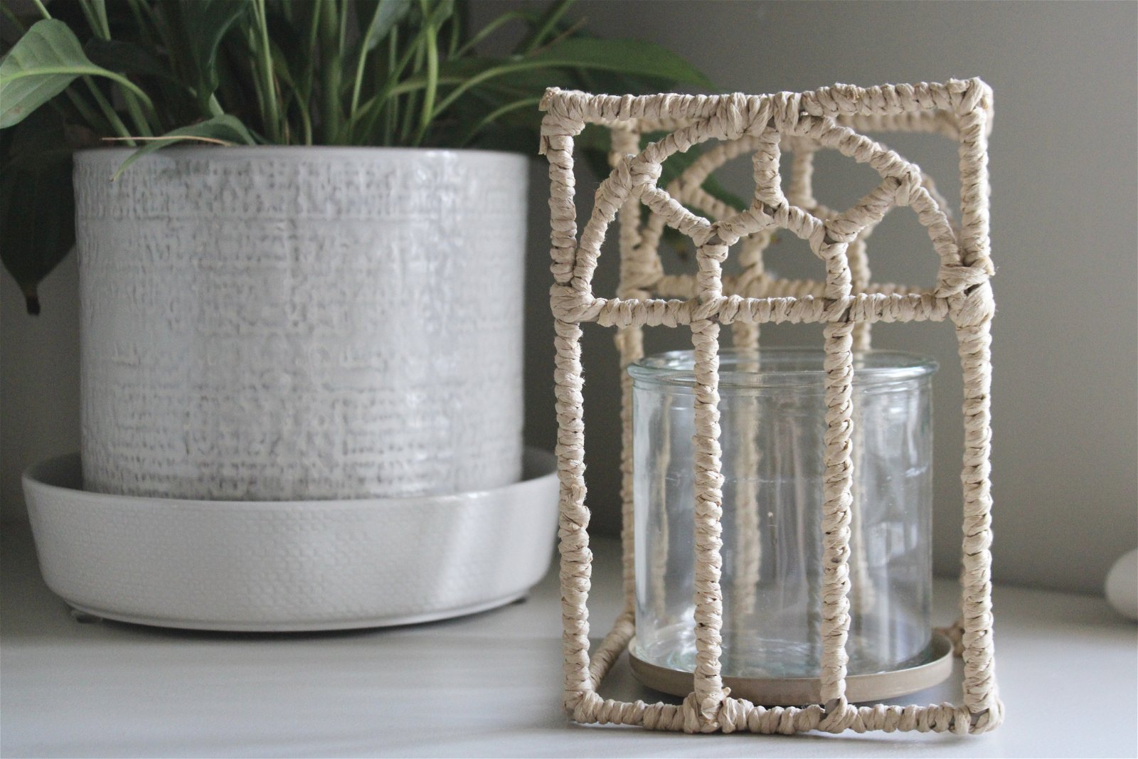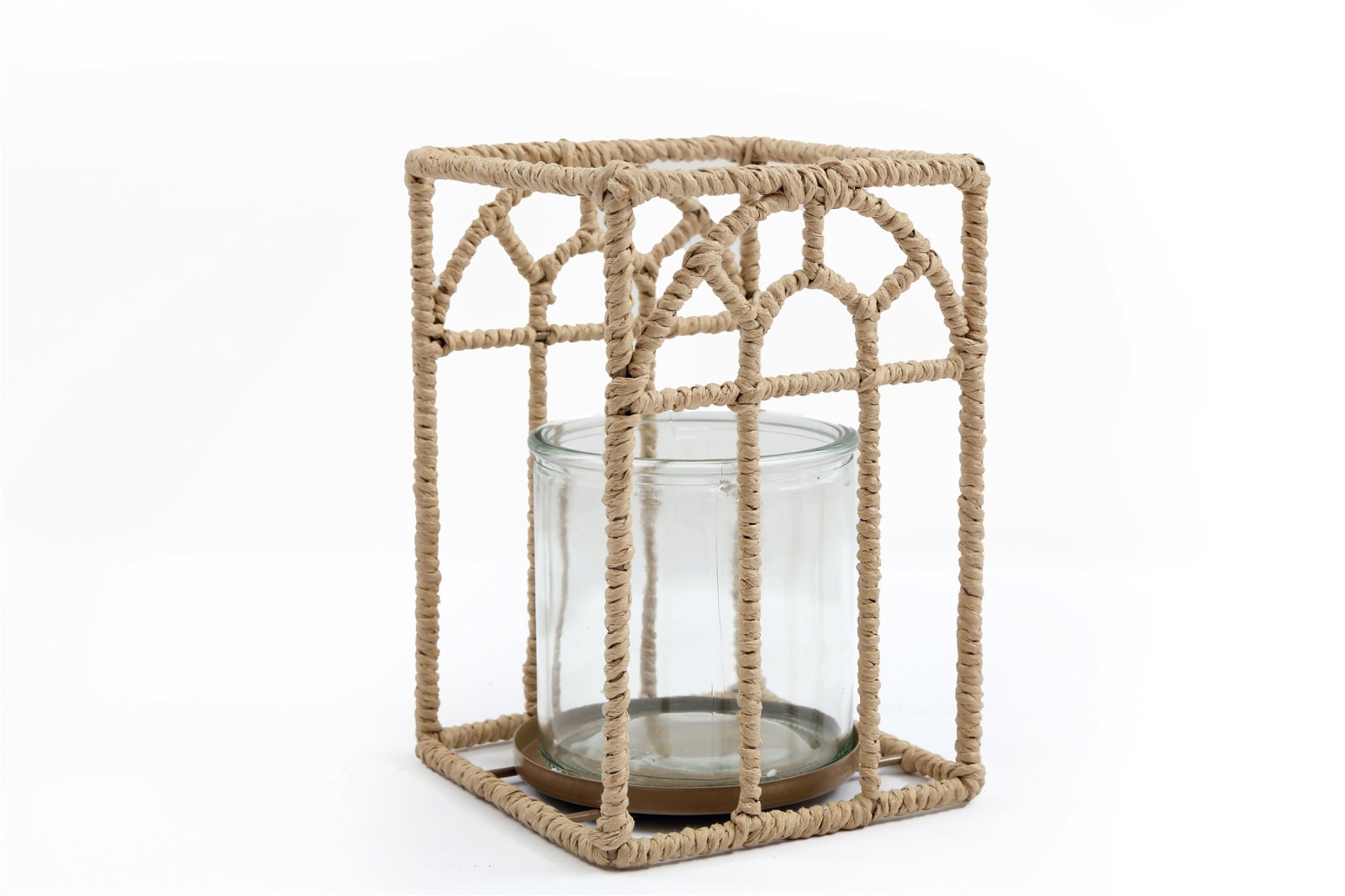 This Boho style hurricane candle holder features a geometric design frame wrapped in rattan, combined with a central clear glass cylinder for one pillar candle. Simultaneously neutral, bringing an enchanting glow to any space it alights upon. Measurements: D13 x H19 x W13cm