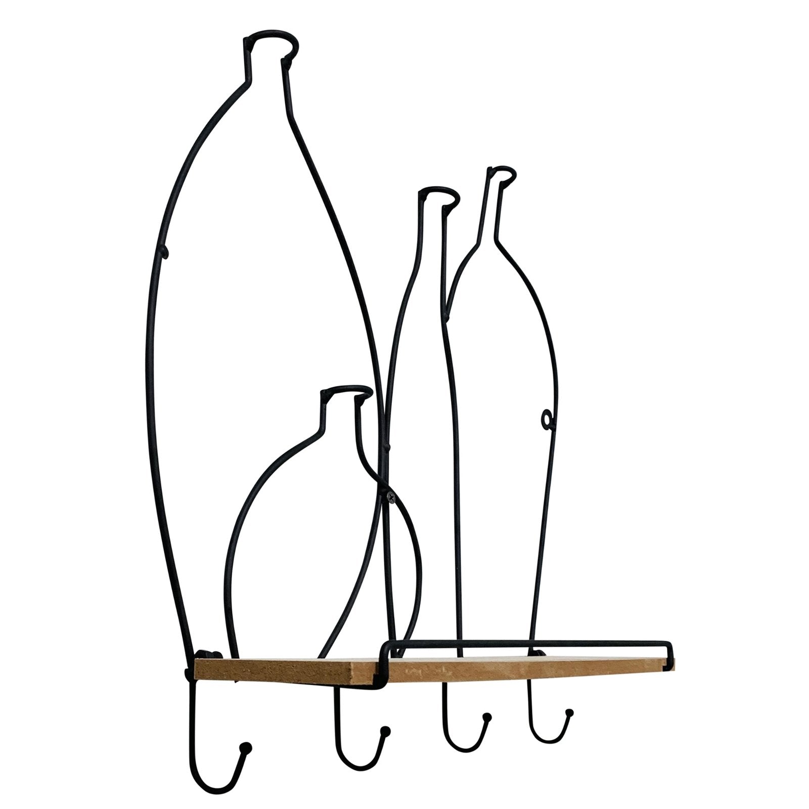 This shelving unit of black sculptured wire depicts four wine bottle shapes, with a shelf and four hooks. The styling befits any culinary area and is both practical and attractive. Wall hanging wire shapes of 4 bottles (40x34.5cm) with a pull down MDF shelf measuring 36x9x0.5cm with 4 hooks below with a distance between of 11 cm. The unit overall measurements are: D11 x H41 x W40cm SKU: WF2508