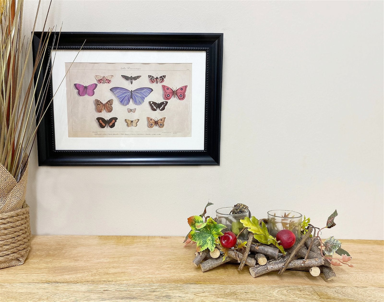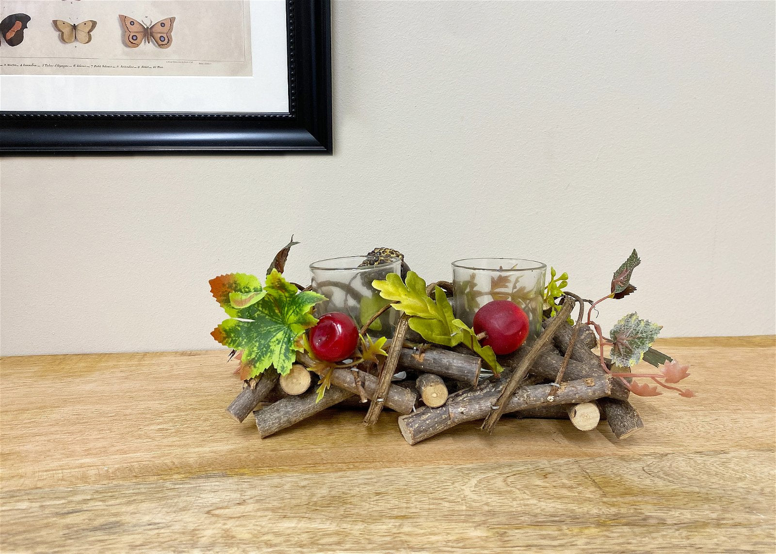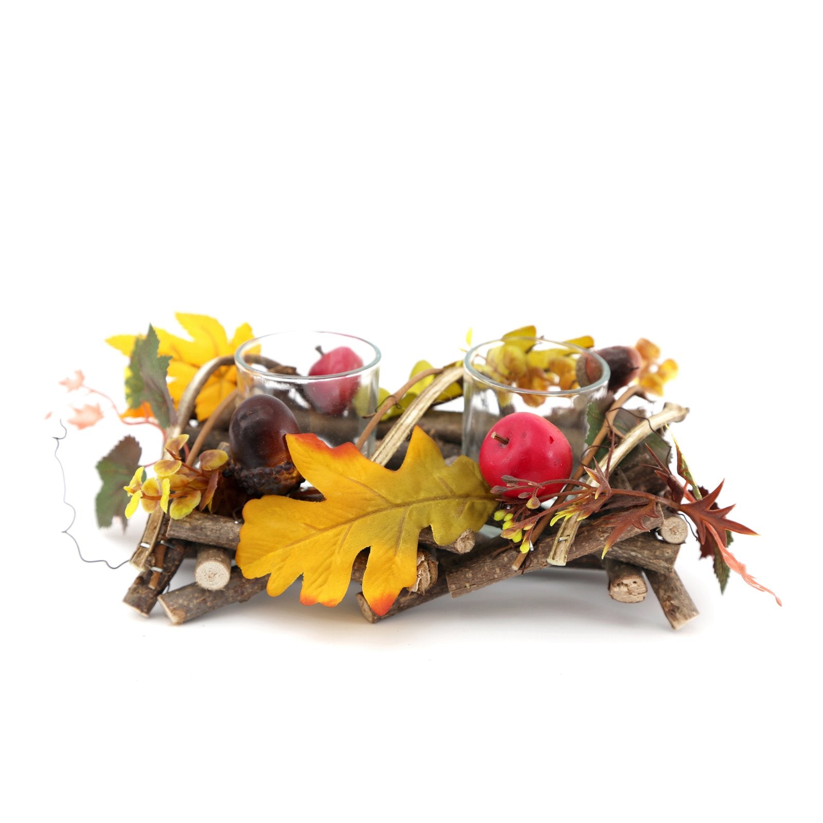 A carefully constructed woodland themed form of small chopped branches randomly placed to create a nest in which the two tea lights sit. The branch basket is intertwined with vines and decorated with artificial leaves, berries and acorns. The tea lights sit 2cm apart and are 5.5cm x 6cm. Measurements: D14.5 x H10 x W22cm