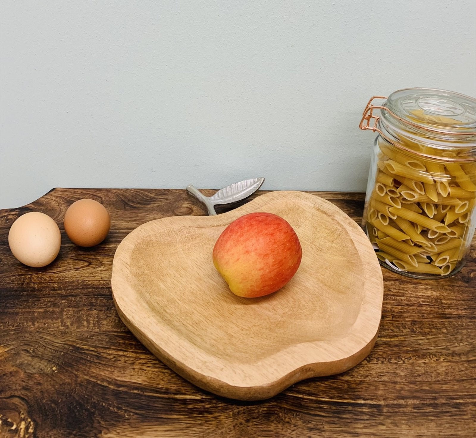 This stylish wooden apple designed tray with a silver metal stem would be a useful addition to any home. The simple design in wood gives the item a natural feel. The tray measures 18x15cm with the metal stem and leaf measuring 5x7cm. Overall measurements are: D18 x H3 x W21cm SKU: KG0993