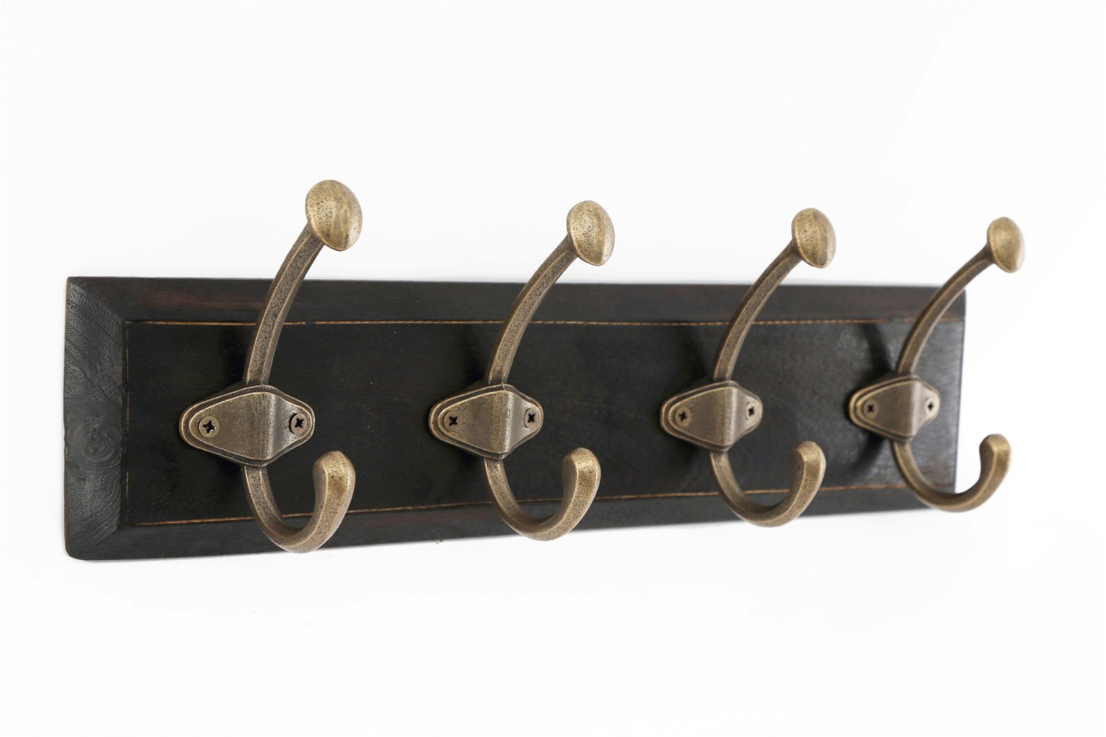 A natural wood plaque with bevelled edge and detailing border. The four large coat hooks are made of burnished brass. The craftsmanship produces an overall effect that is both traditional and elegant. Plaque measurements: H10.5 x W44.5 x D3cm. Hook measurements: H16.5 x W3.7 x D9.5cm. Distance between hooks 6.6cm. SKU: HH5787
