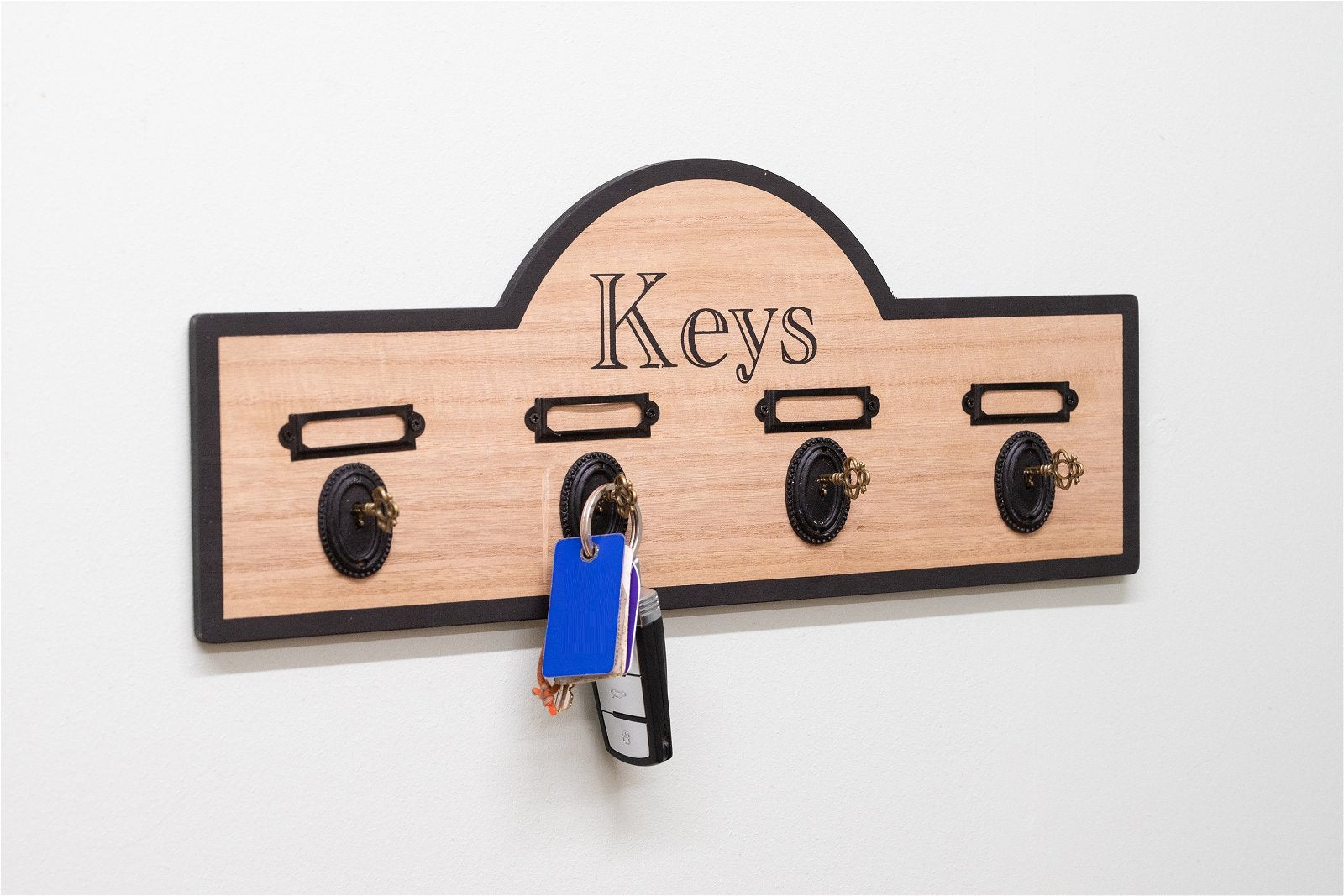 This wooden board with four key style hooks and label fields. Natural wood with black detail provides a functional piece for any home. A wooden board with 4 key hooks with name display all 10cm apart. Overall measurements are: D5.3 x H18 x W43cm SKU: KG0997
