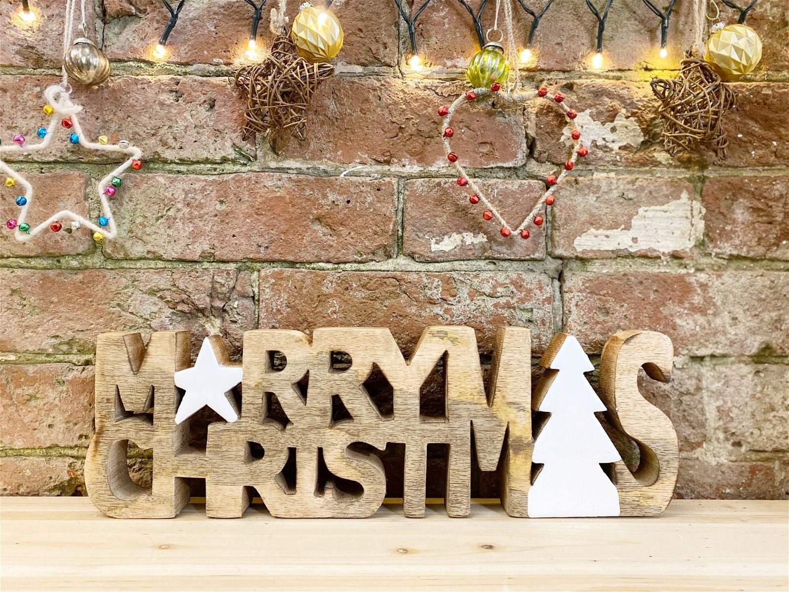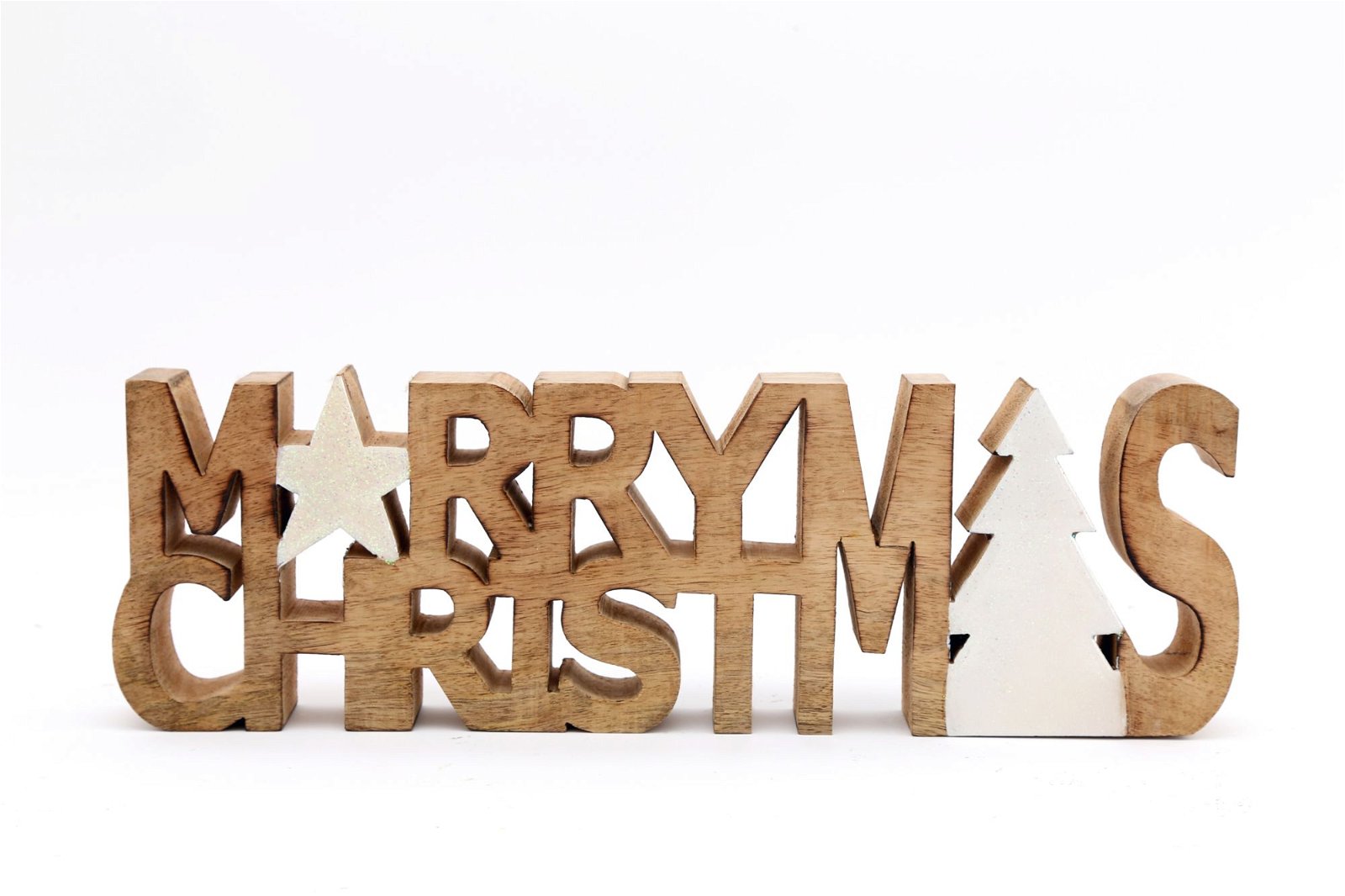 A natural wood block carved out to spell MERRY CHRISTMAS with the E replaced by a star shape and the A is a Christmas tree shape both of which are coated in a white glaze. A robust piece which would compliment all festive decorations. Overall measurements are: D3.5 x H13 x W41cm