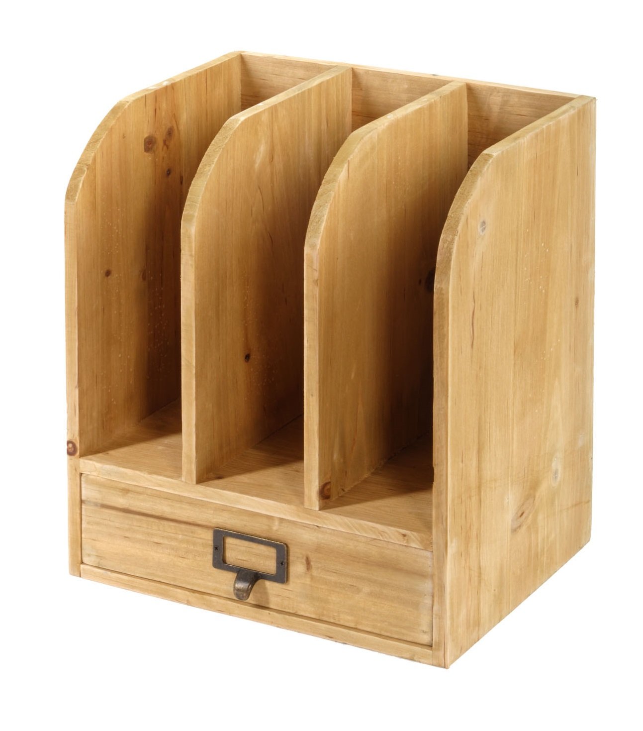 Attractive wooden desk top file /paper work holder with drawer below. Well made in a light coloured wood this item would be very useful in any office environment. Made up of 3 compartments with a useful drawer below opened with a metal handle. Internal drawer dimensions are 25 x 19 x 6cm and each of the 3 open compartments are 8cm wide. Measurements are 30 x 23 x 35cm. The nameplate card insert size is 4.5 x 2.5cm with a display area of 4 x 2cm (not included).