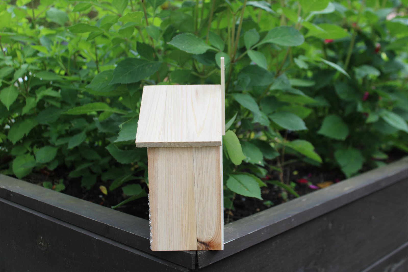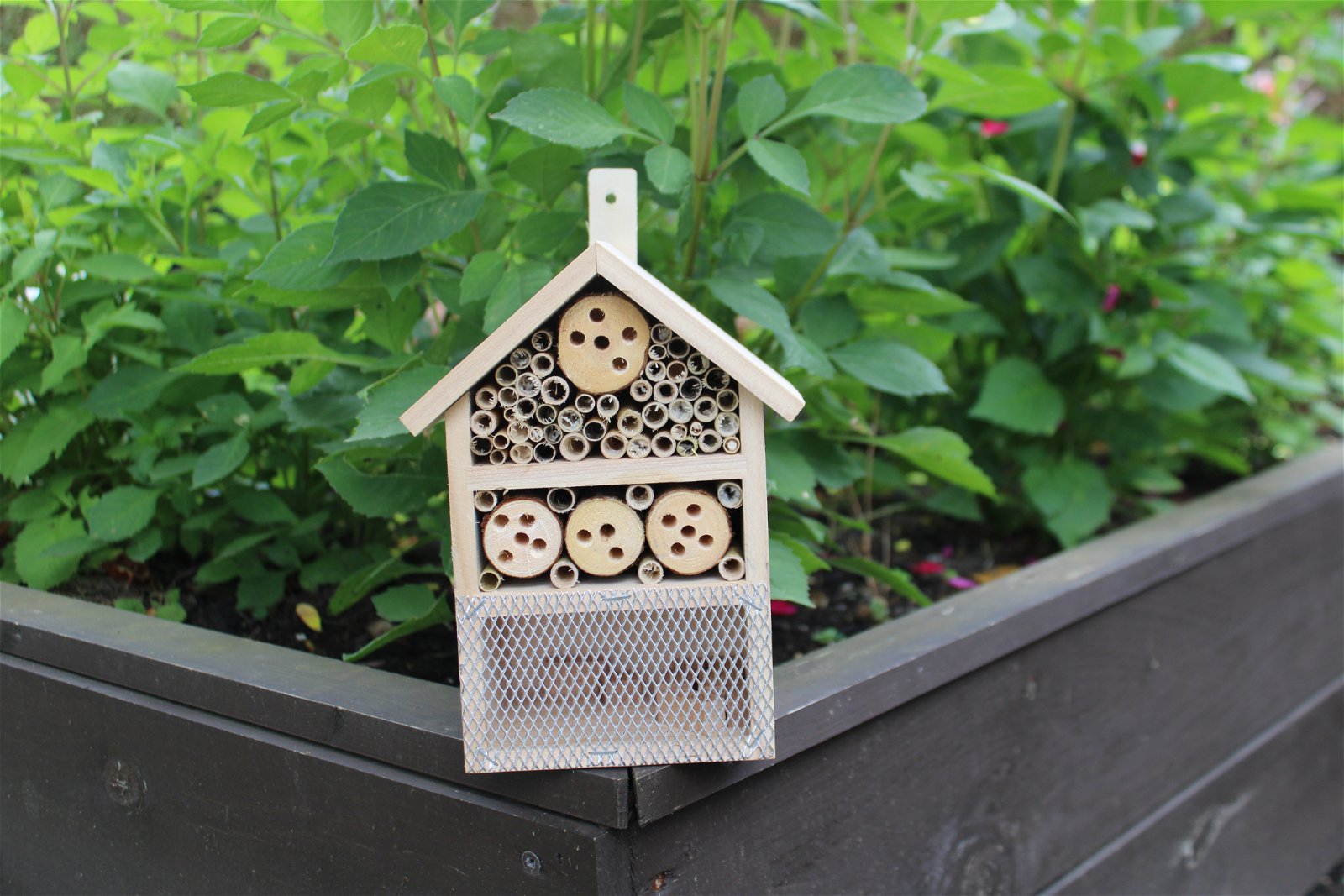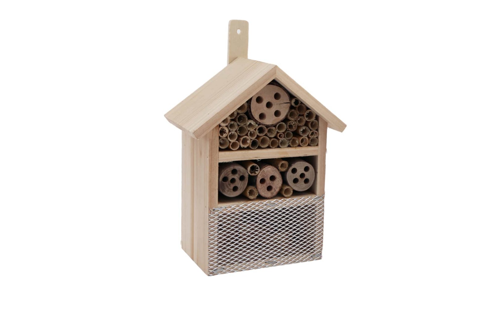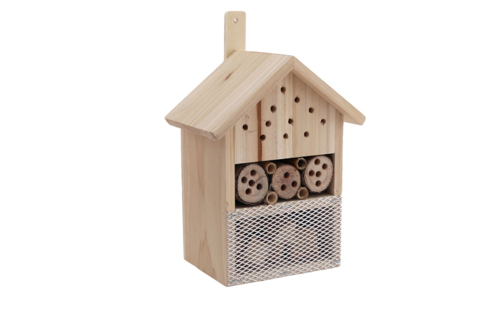 This house shaped insect shelter offers three compartments filled with different materials for insects to nest in. Features a pre-drilled hole, ready to be hung up or placed outside. Measurements: D9 x H23.5 x W12cm