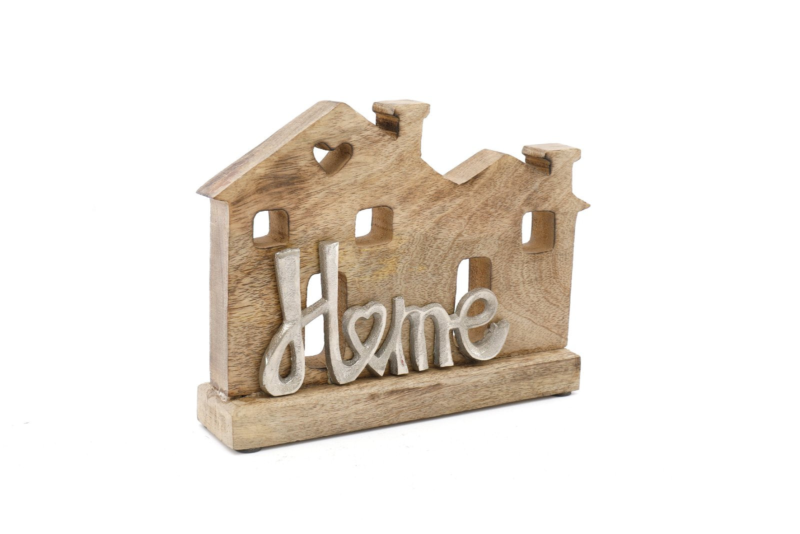 This hand carved wooden and alloy display would be perfect as a gift for a new homeowner to decorate a bookshelf of sideboard. The natural wood allows it to fit into any style home and the alloy lettering doesn't distract from the carved house. Hand carved wooden house on a wooden plinth measuring 26x5.5x3cm with silver alloy written HOME. Measurements: D21 x H5.6 x W26cm SKU: OR1714