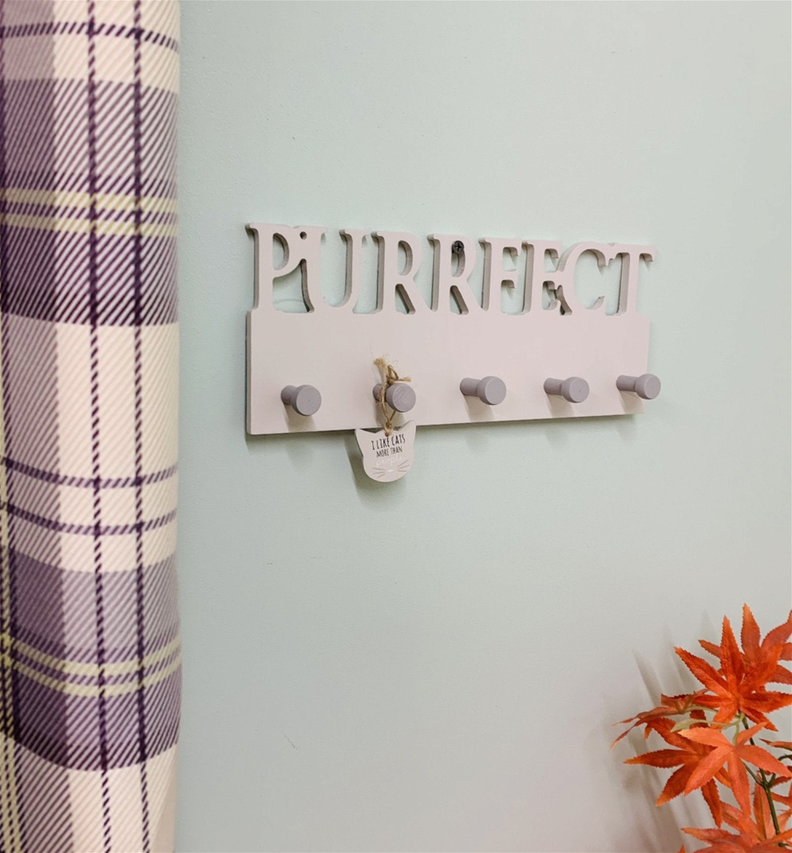 This 'PURRFECT' hook board would be perfect in a porch or hallway to hold lightweight coats, leads and harnesses for a cat. The simple grey and white colours would blend into any decor. MDF carved PURRFECT hook board with 5 grey knobs 3.5cm long and 4cm apart. Total measurements are: D4 x H12 x W29.5cm SKU: PG0070