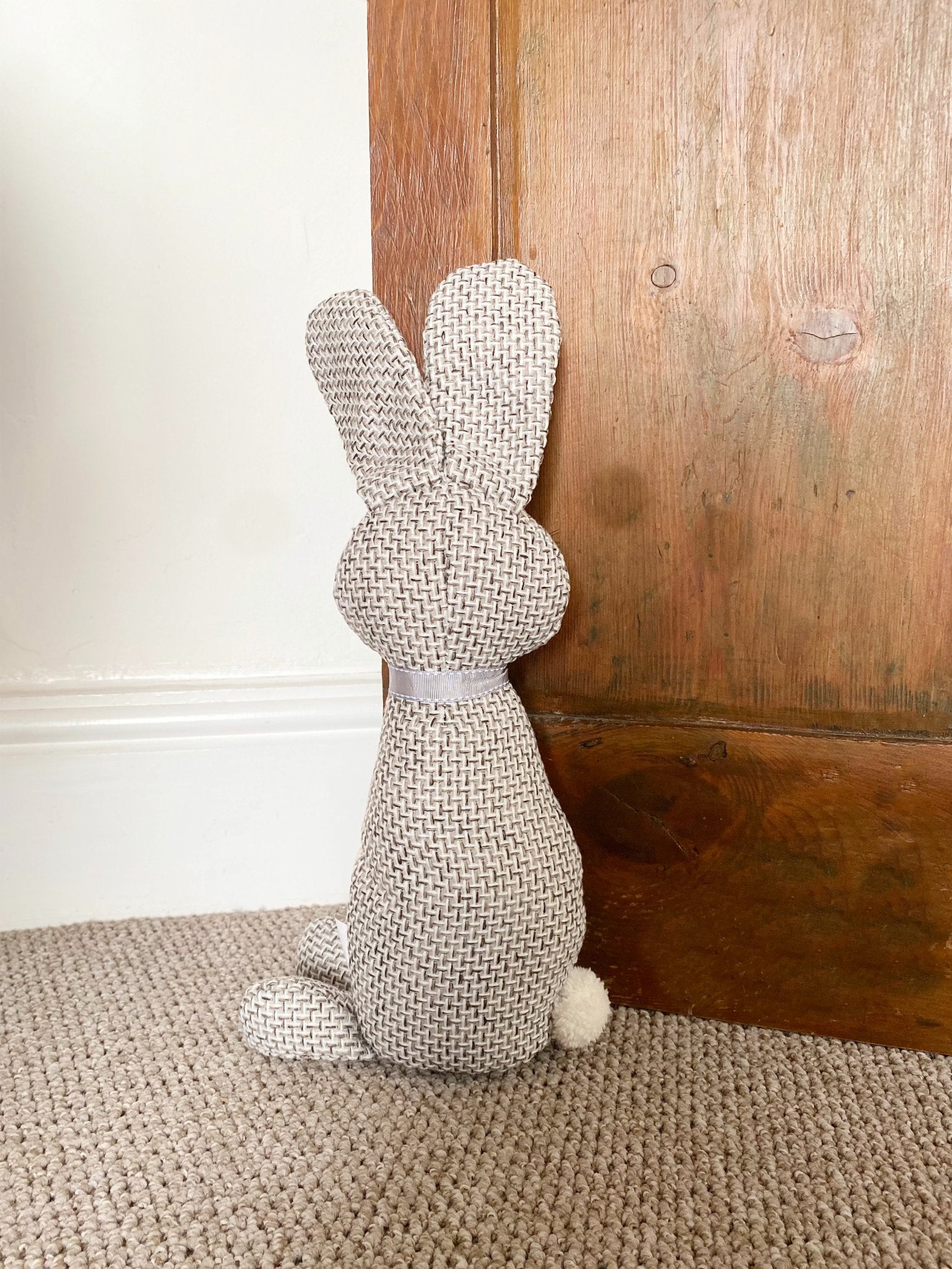 This charming rabbit door stop would look at home holding open any door with its practical yet stylish design. The textured fabric with cream/beige/grey tones and furry tail detail are polyester and can be cleaned with a damp cloth. The item is weighted with sand to keep it in place and keep your doors open. Weighs approximately 1kg. Measurements: D10 x H44 x W19cm