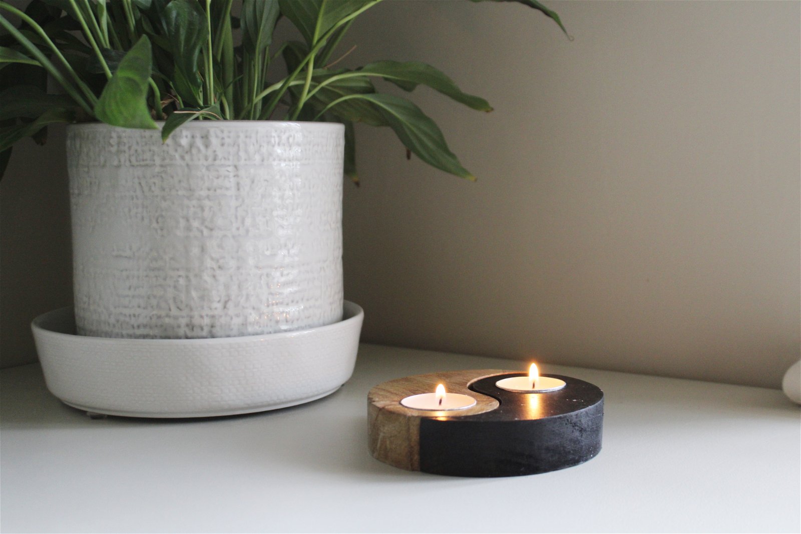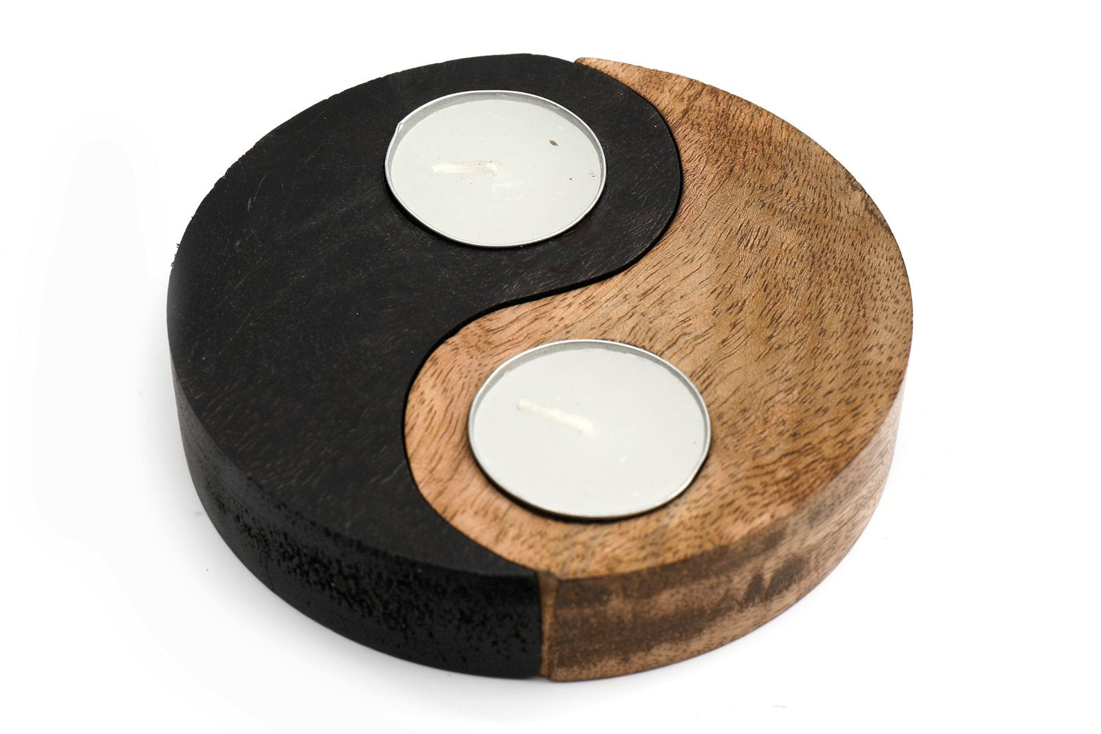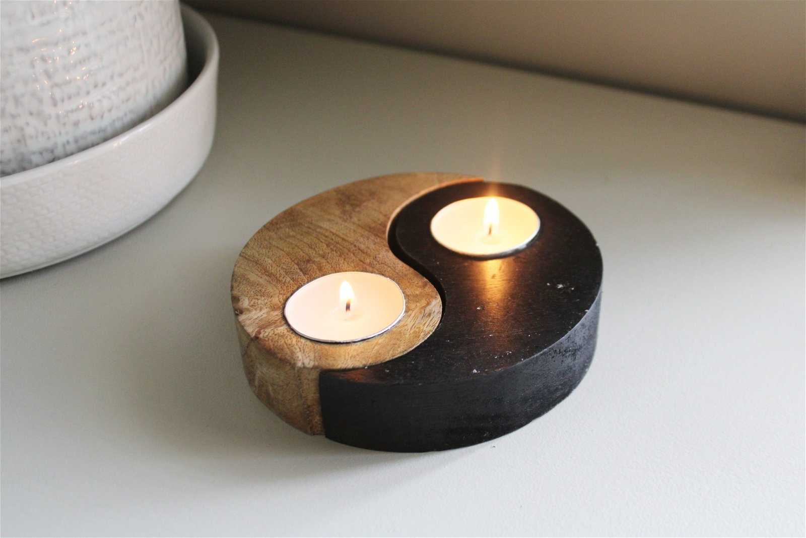 Light the mood in style with this Yin & Yang tealight holder. This eastern style tealight holder features two pieces of mango wood, so you can separate the light and dark holders. Or put both tealight holders together to create the ancient Chinese symbol. These tealight holders are made of high-quality mango wood, which gives them a unique, natural look that's perfect for any home decor style. One side is painted black and the other side is finished in a natural varnish, with the grain of the wood still visible. Perfect gift idea, two tealights included. Measurements: D12.5 x H3 x W12.5cm