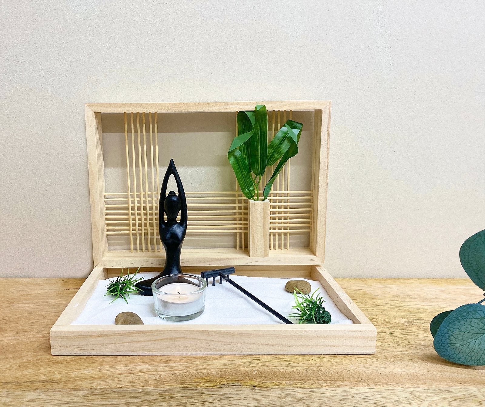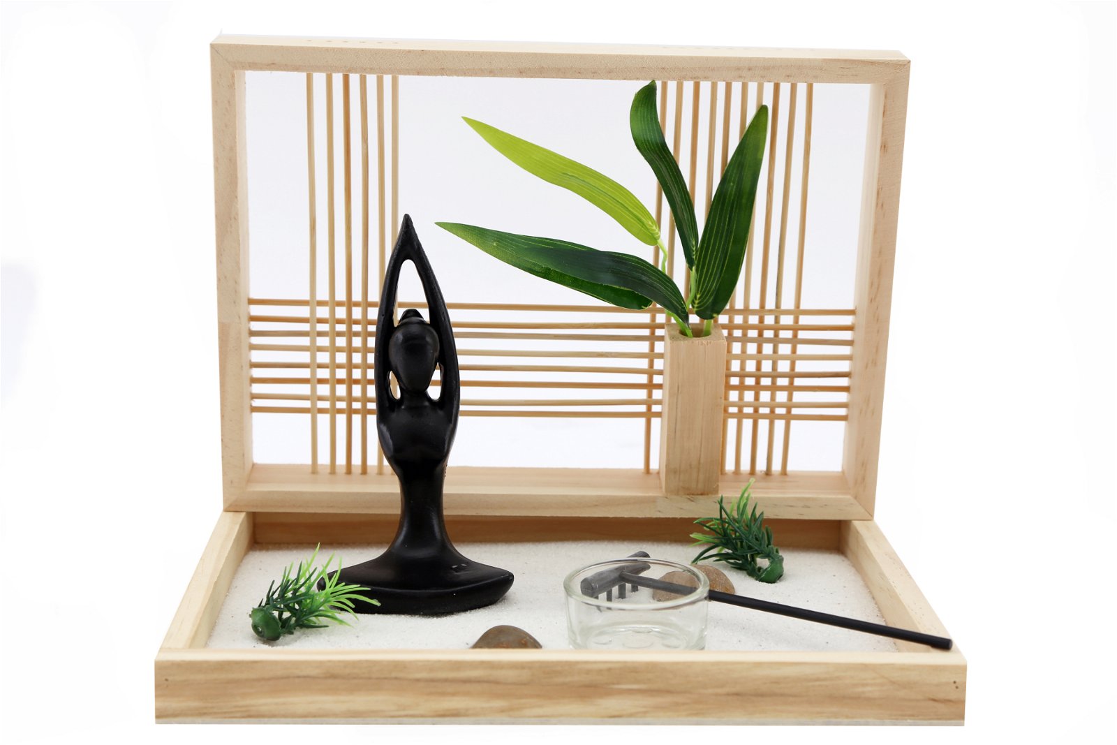 A Zen garden candle holder with white sand and yoga women figure. This self assembly zen garden comprises of a wooden tray and lattice backdrop, white sand, lady in a yoga position and various miniature structures to enhance the overall effect. There is a glass tea light holder (tealight not supplied) which when lit will complete the overall effect. Measurements: D6 x H19 x W25.7cm